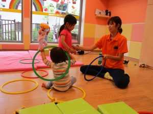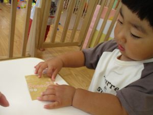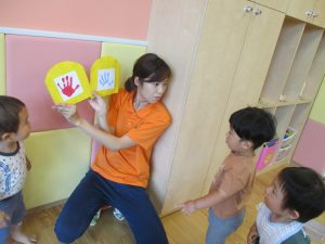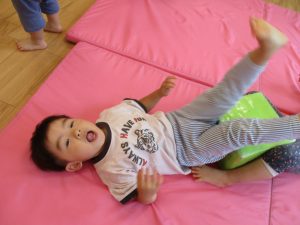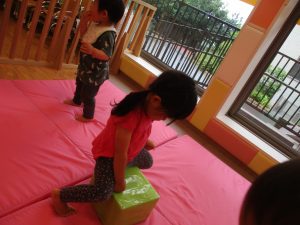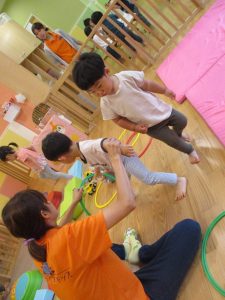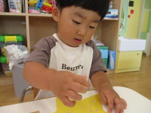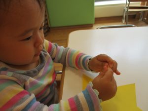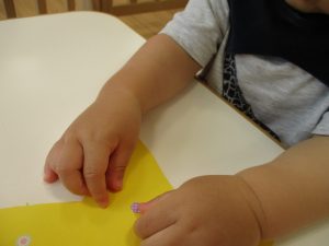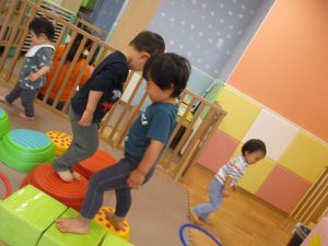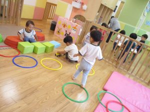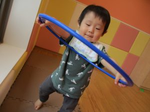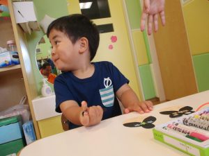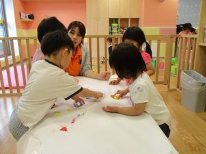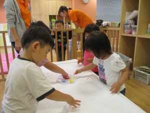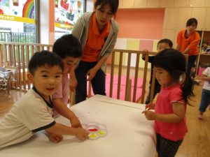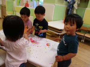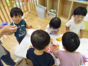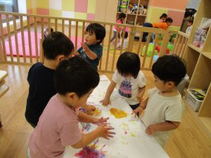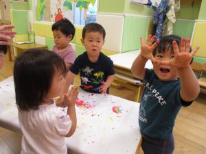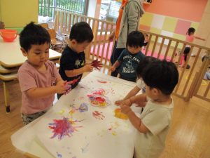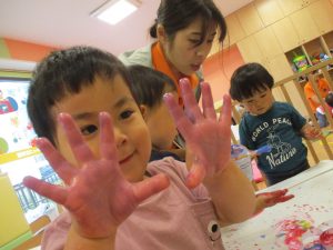 絵の具のフィンガーペイントを楽しんだり、フラフープ、マット、平均台を使ってたくさん体を動かしました!