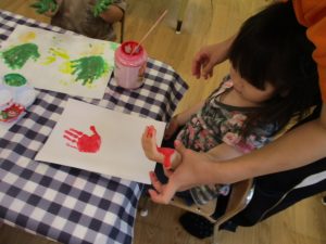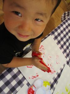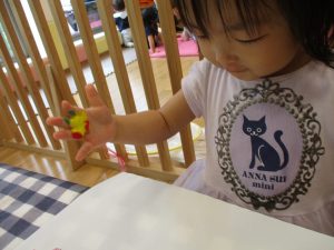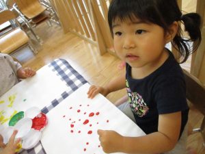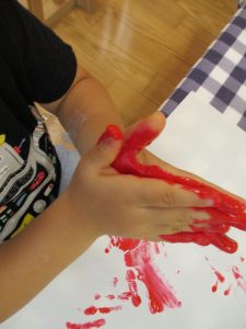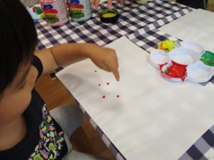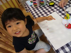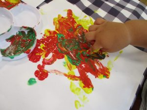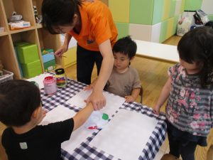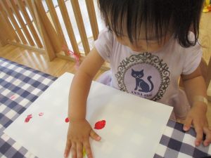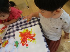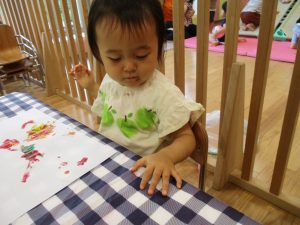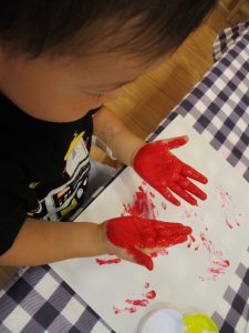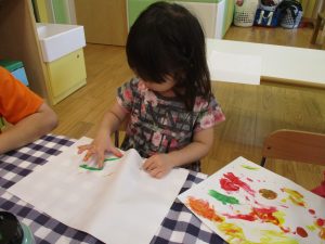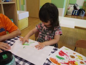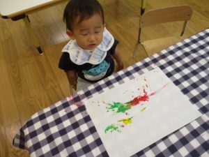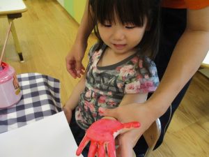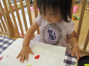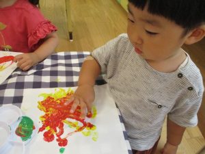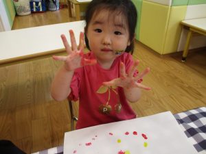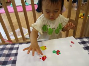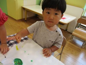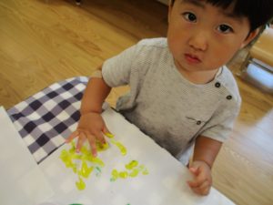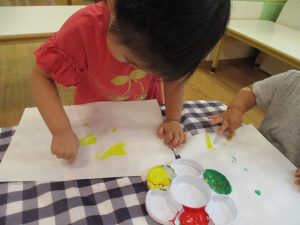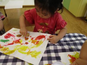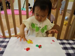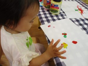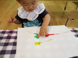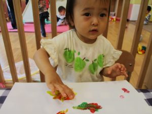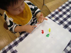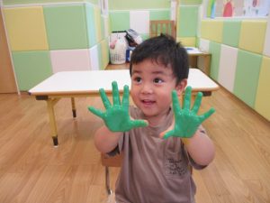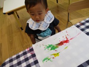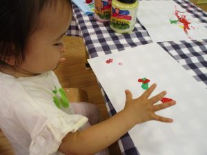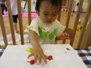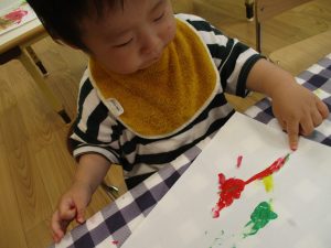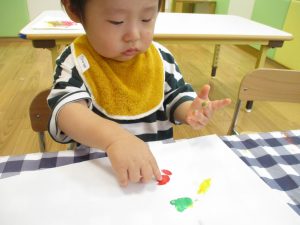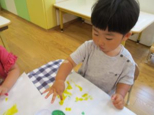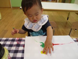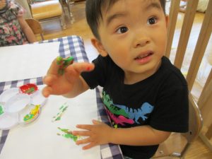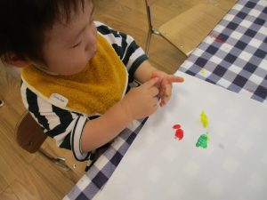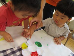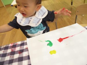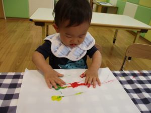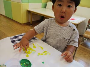 フィンガーペイントも気が付くと手のひら一面に絵の具がついて手形スタンプを楽しみました。