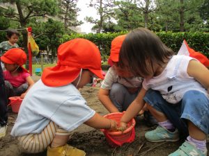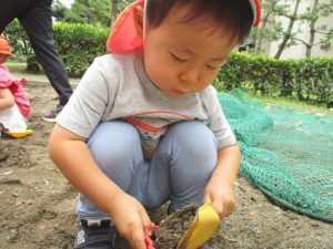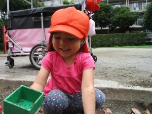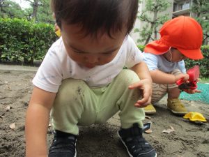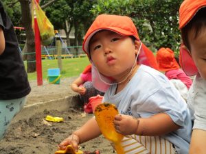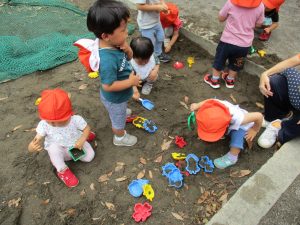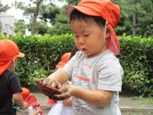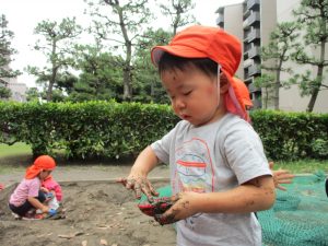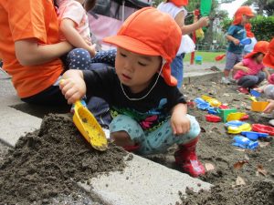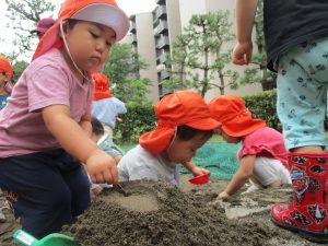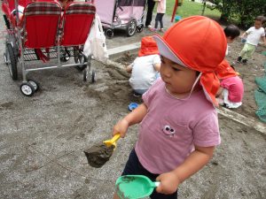 水遊びはなかなか行えないけど砂場での泥んこ遊びを皆で楽しみました!