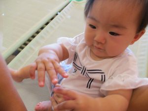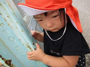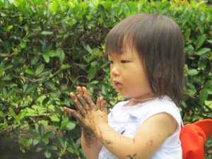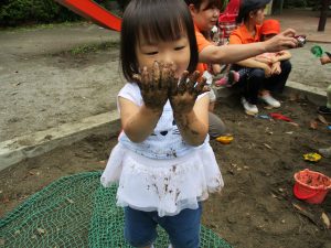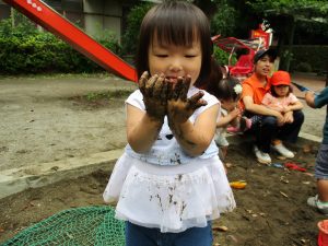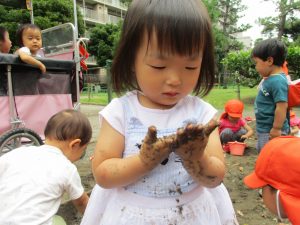 泥の感触に不思議がる表情がなんとも可愛いですね。