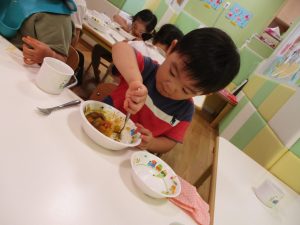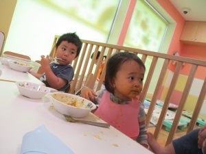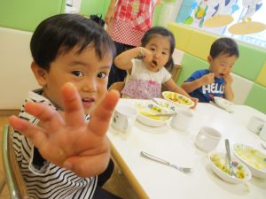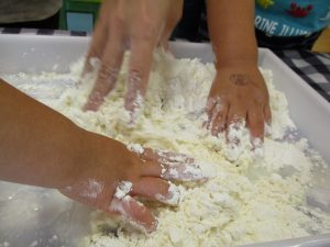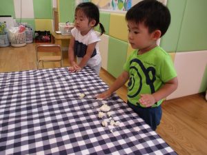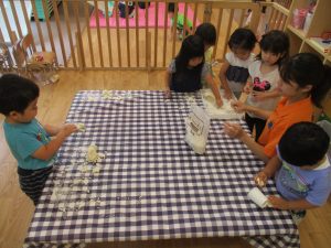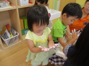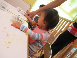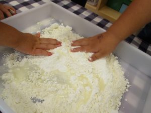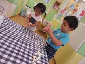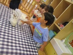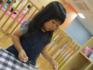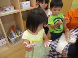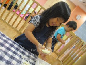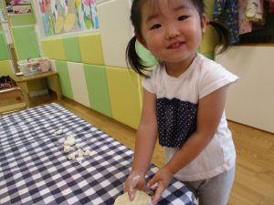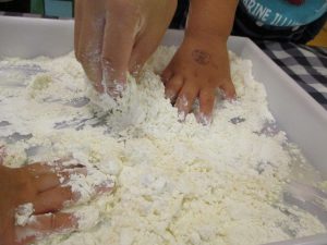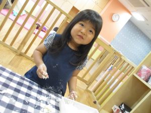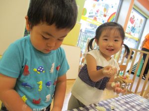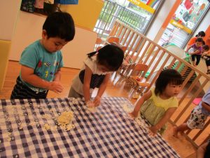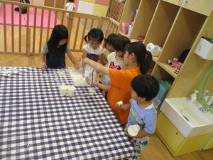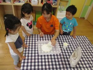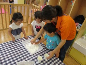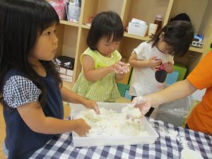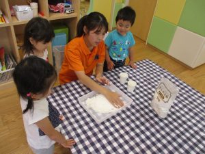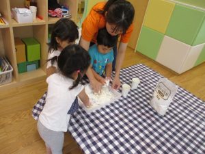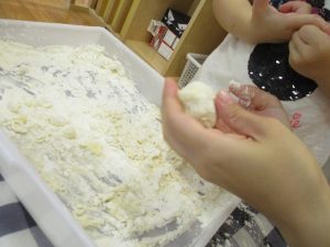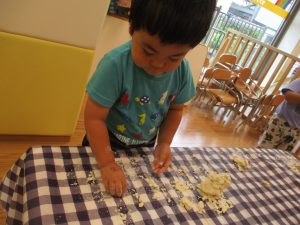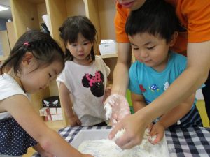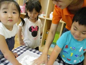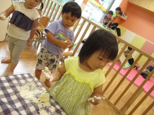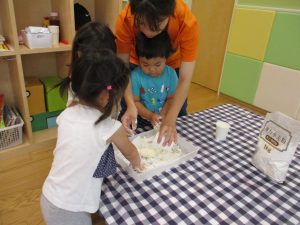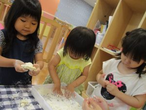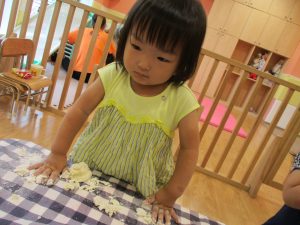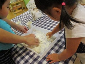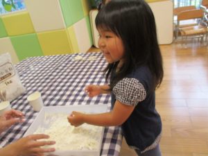 粘土遊びも普段から楽しんでおりますが本物の小麦粉を練ると言った貴重な経験は、子ども達にとってとても刺激的だったようで文字通り「夢中」になって遊んでおりました♪