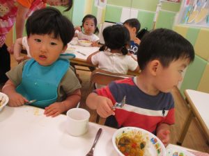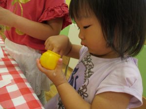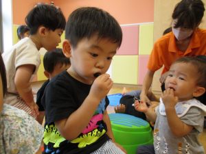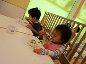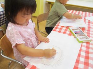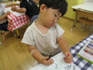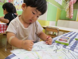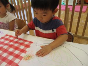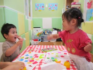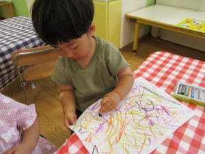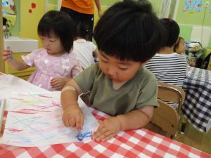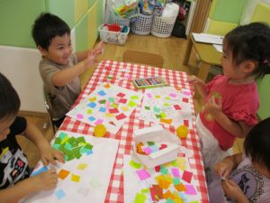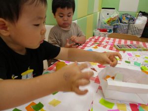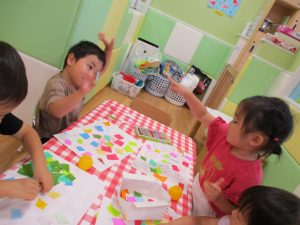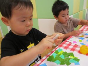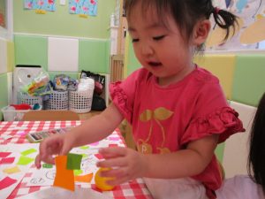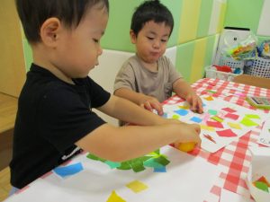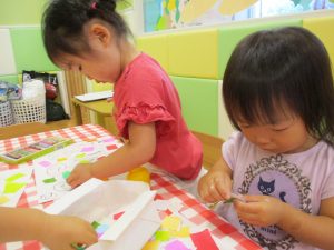 折り紙を契って糊で貼ると言った少し複雑な作業も2歳児さんを中心に楽しんでおりました。