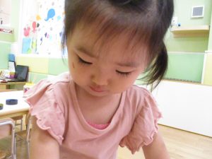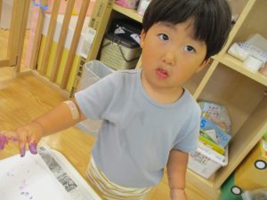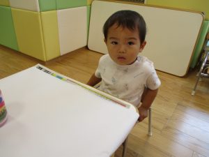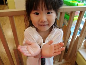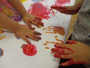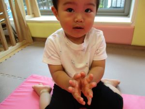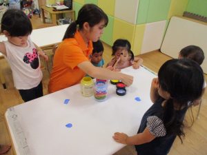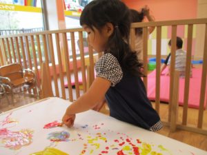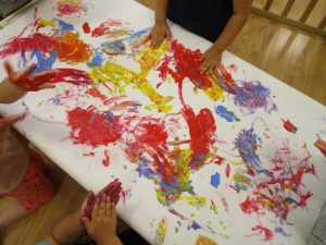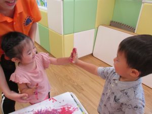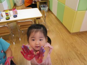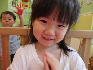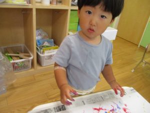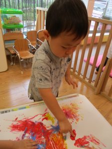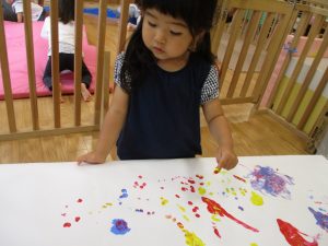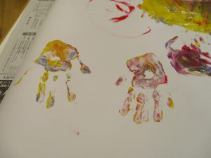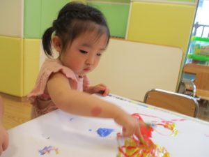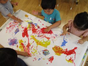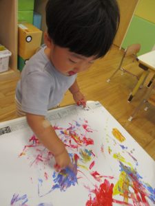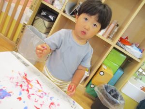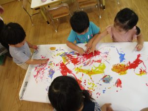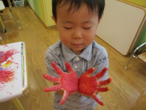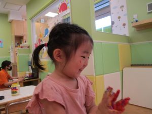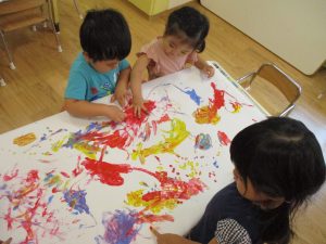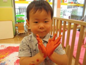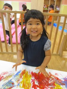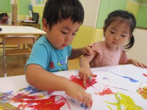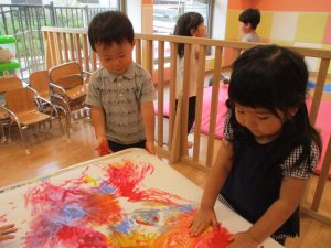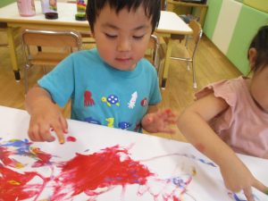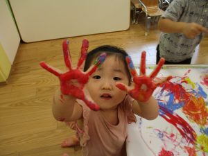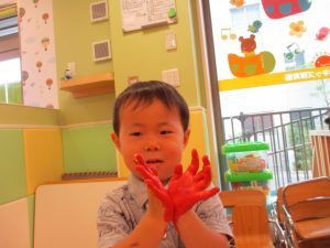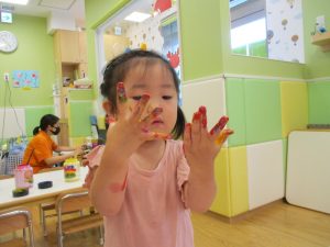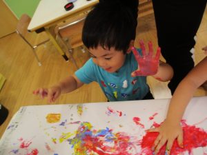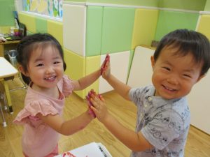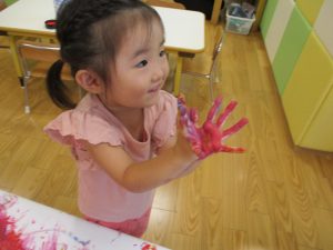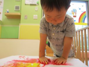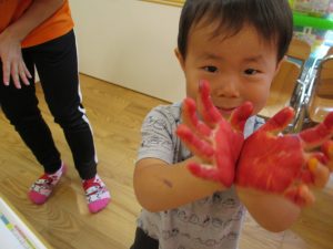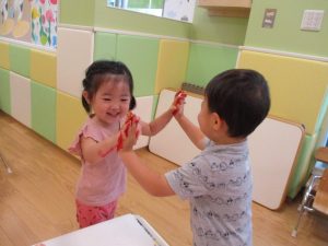 両手いっぱいについた絵の具を友達と手のひら同士で合わせてみたり「先生見て」と自慢気に見せる姿がなんとも可愛いですね♪