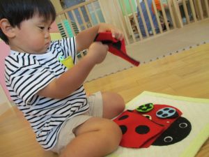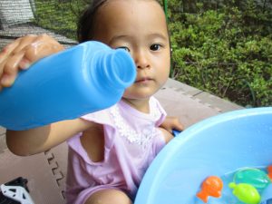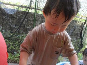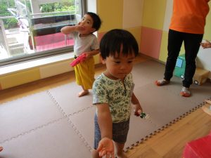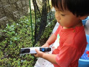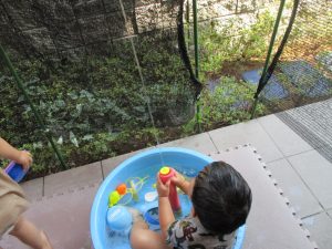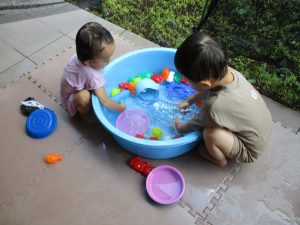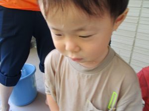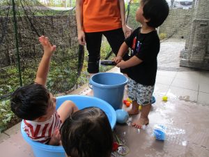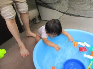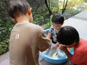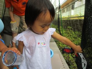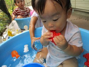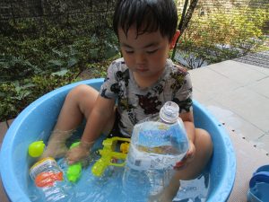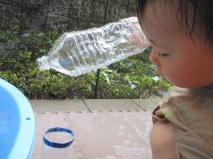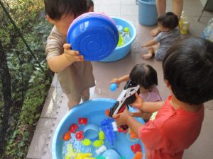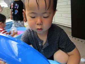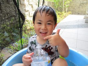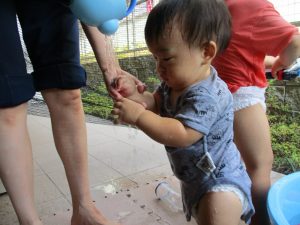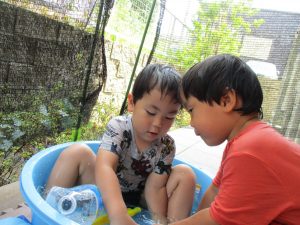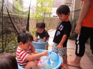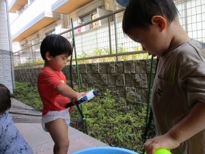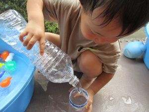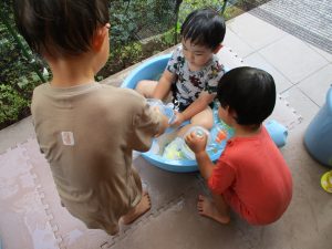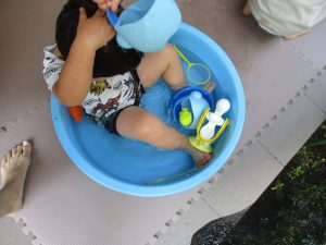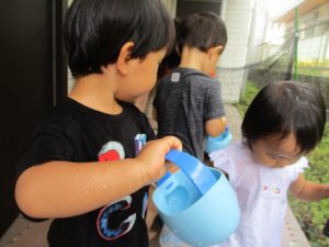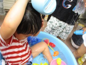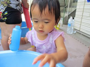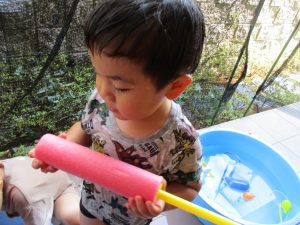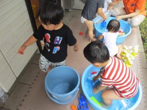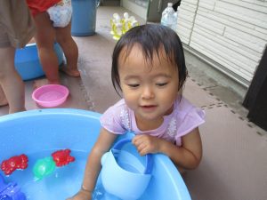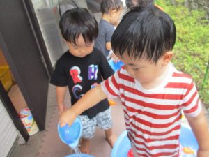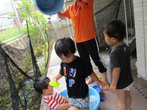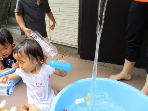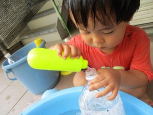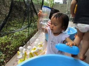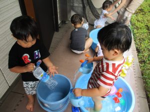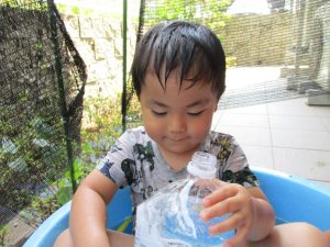 連日の水遊びとなっておりますが、子ども達は日に日に水遊びが好きになっている様で手作りの水遊び玩具を使って水の出し入れや水の感覚を味わっております。
