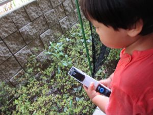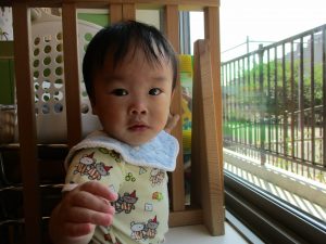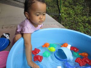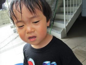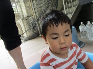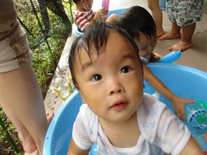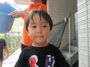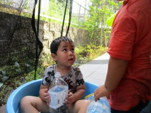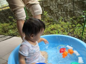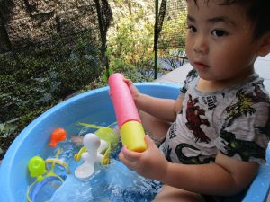 2歳児の男の子は自ら水を被り全身で水を感じております。