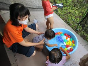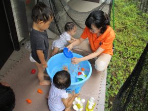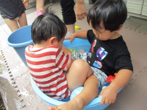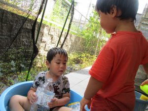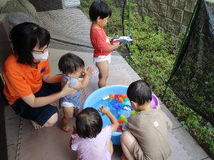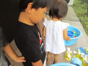 水遊びを楽しむ中に友達や先生達との関りも2歳児さんを中心に多くなって参りました。
