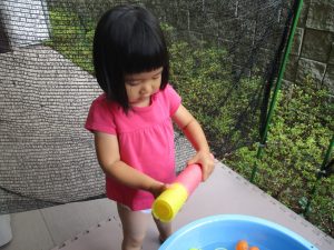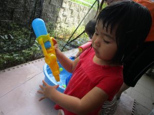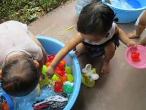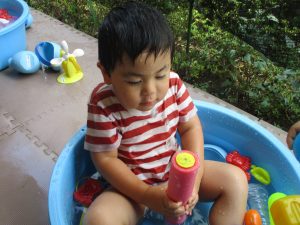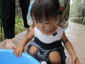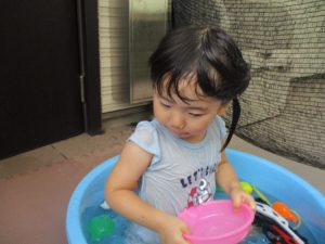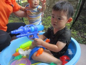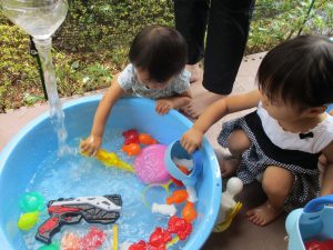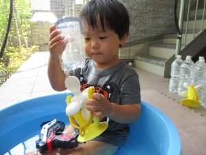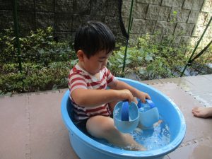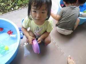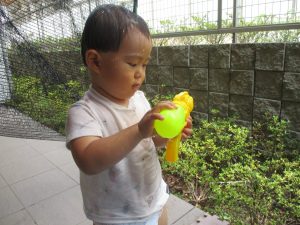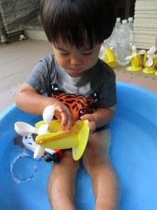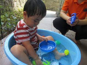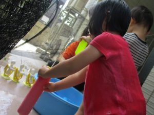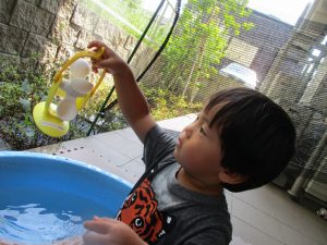 水遊び玩具を使って水の感触や水の流れを不思議そうに見て楽しんでおります!
