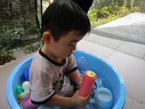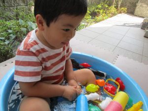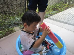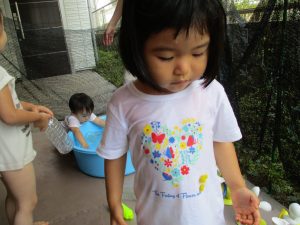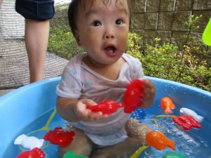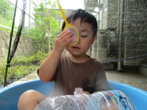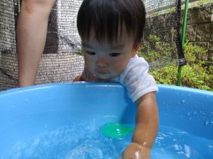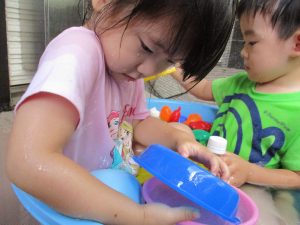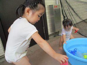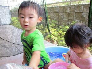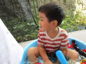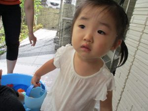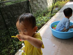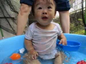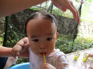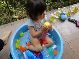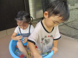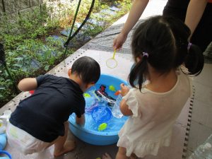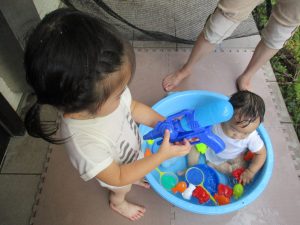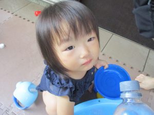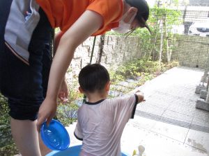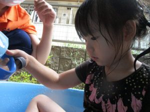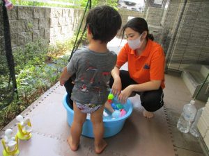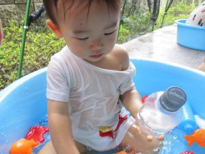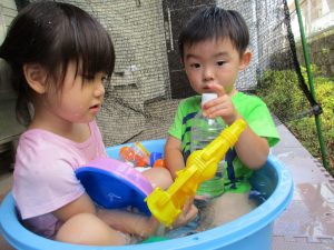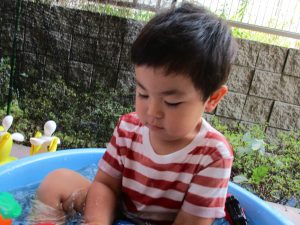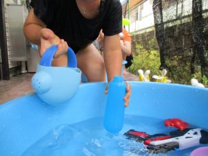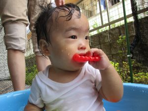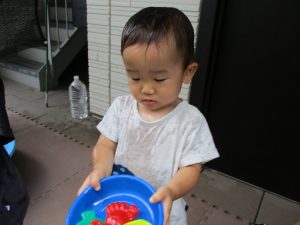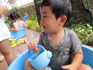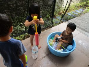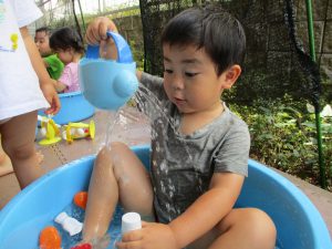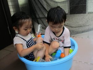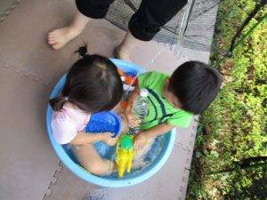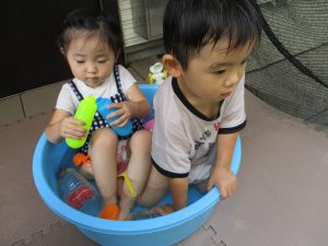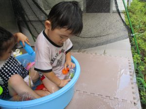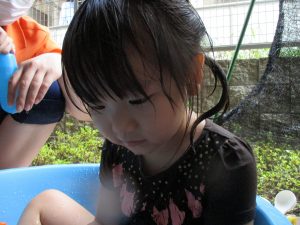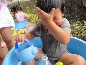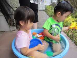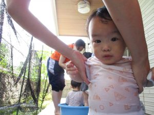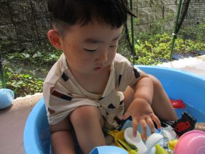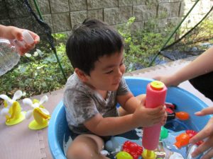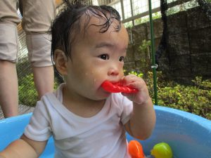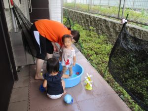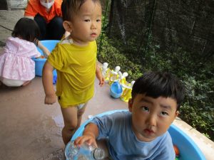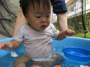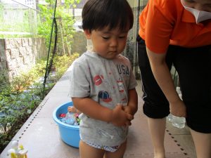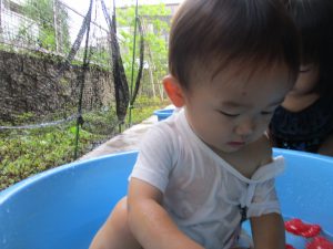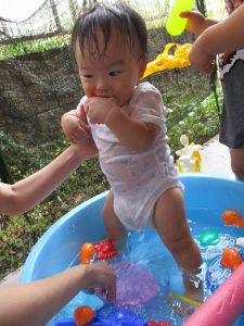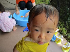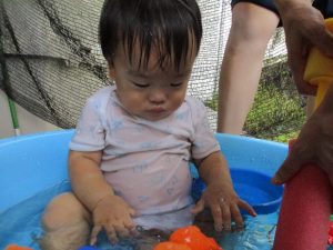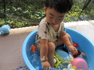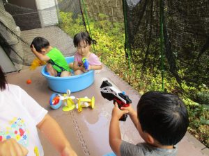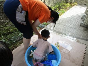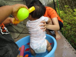 この日は全体的にタライに浸かる子が多く水遊びならぬお風呂ごっこと言った所でしょうか?