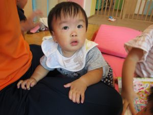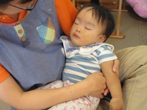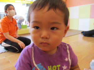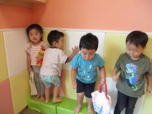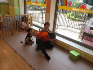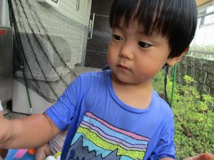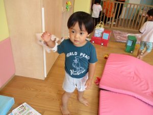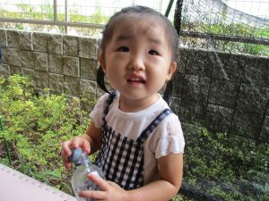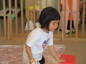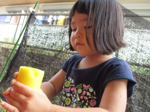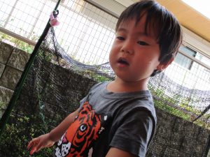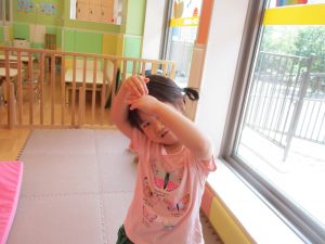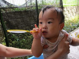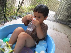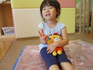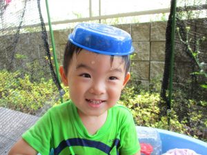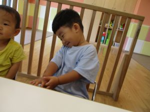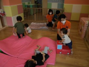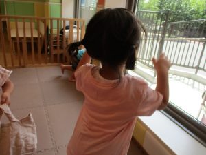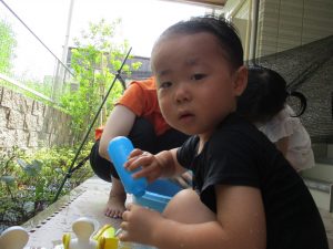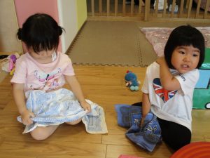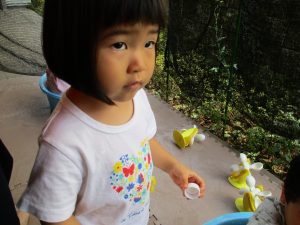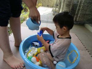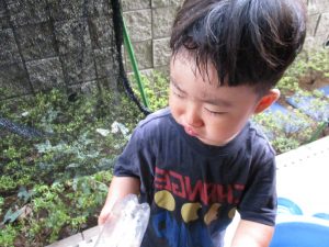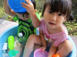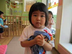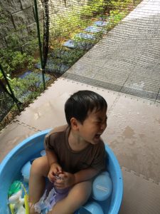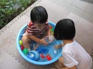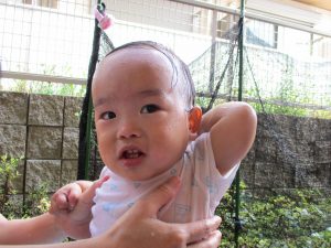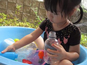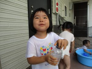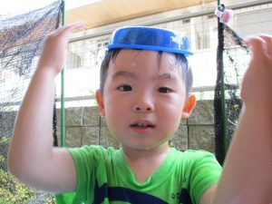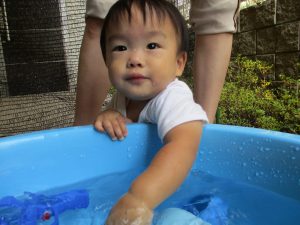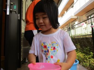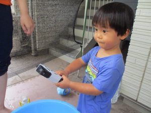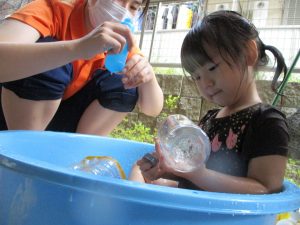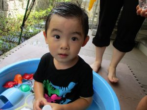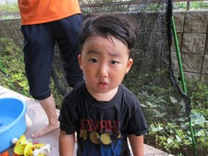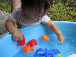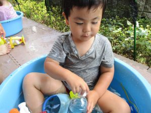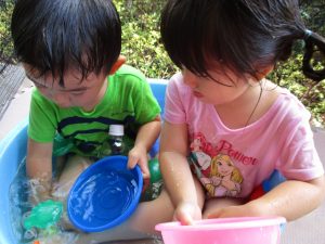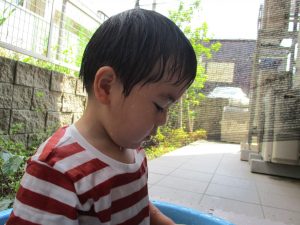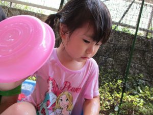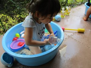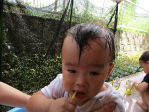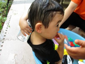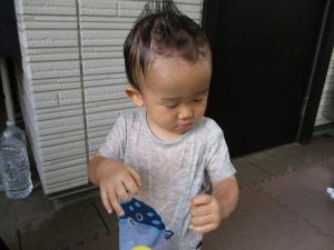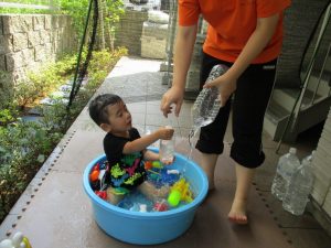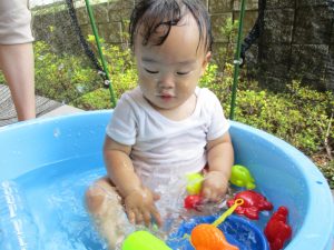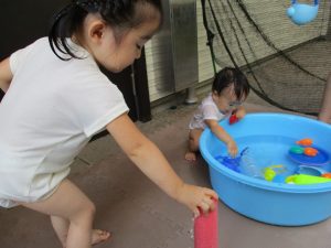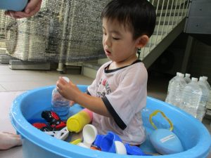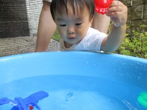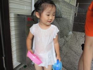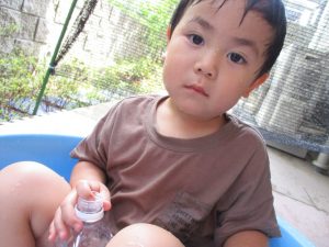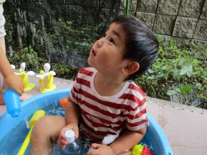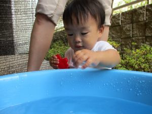 この日は全体的にタライに浸かる子が多く水遊びならぬお風呂ごっこと言った所でしょうか?