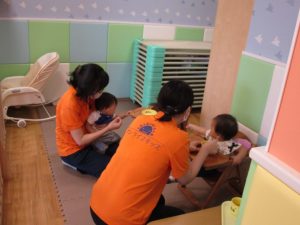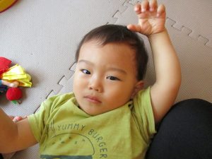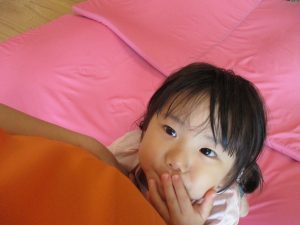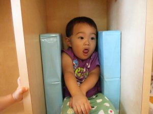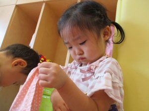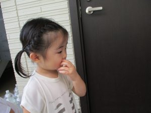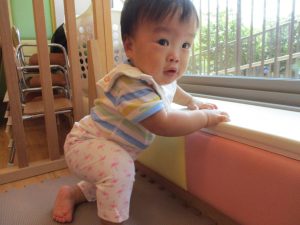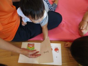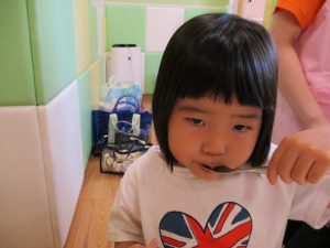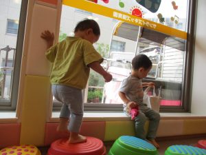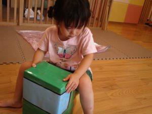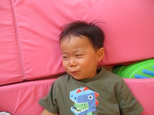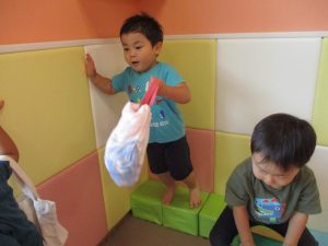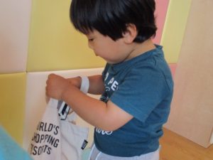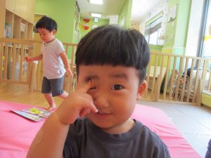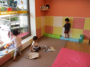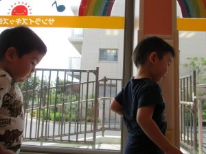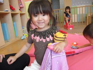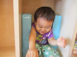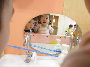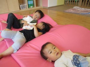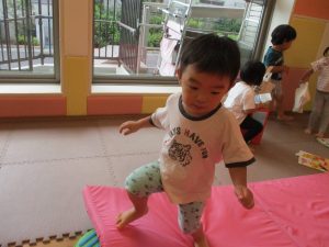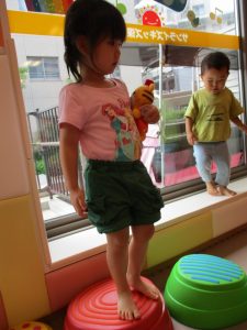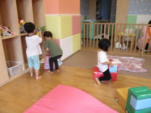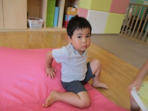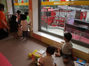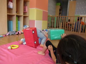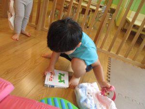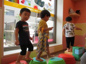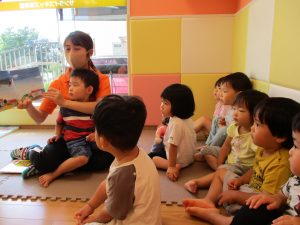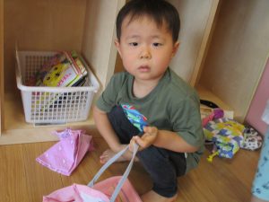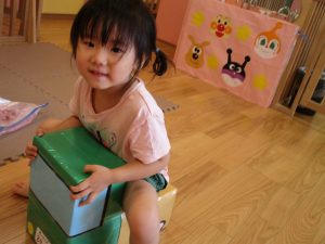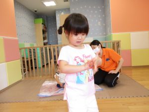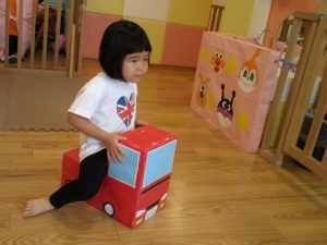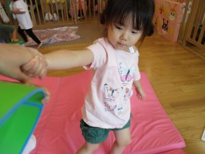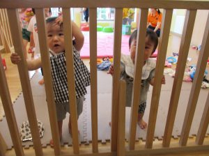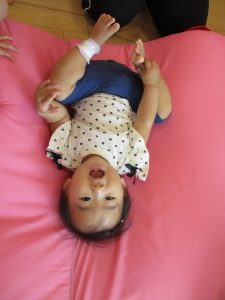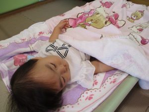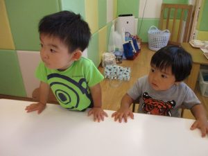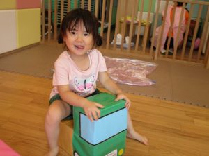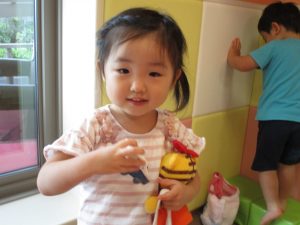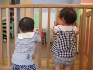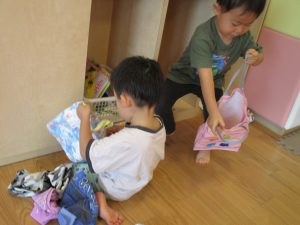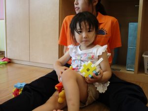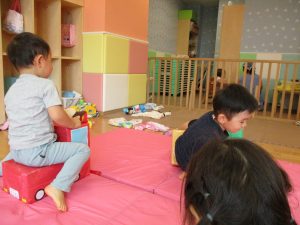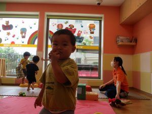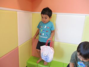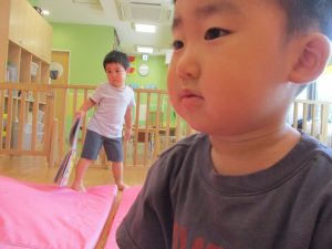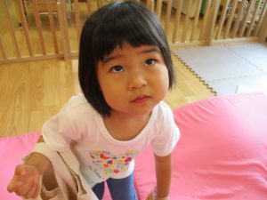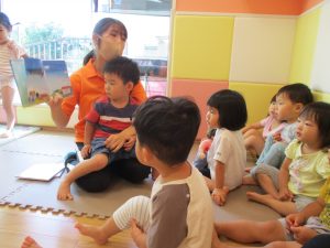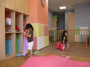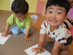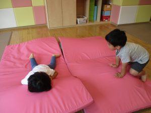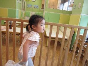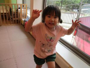 この日は全体的にタライに浸かる子が多く水遊びならぬお風呂ごっこと言った所でしょうか?