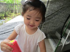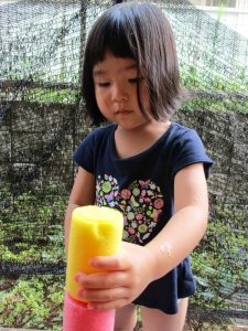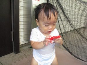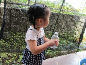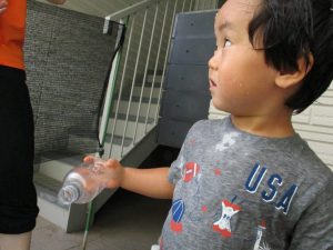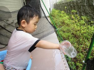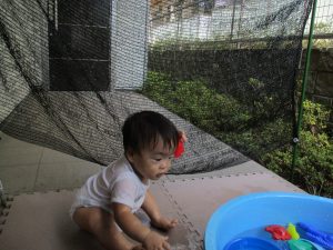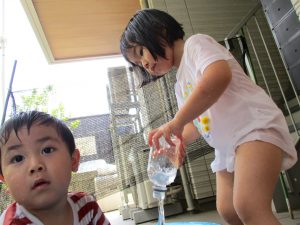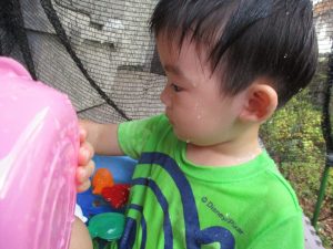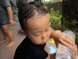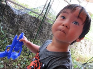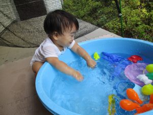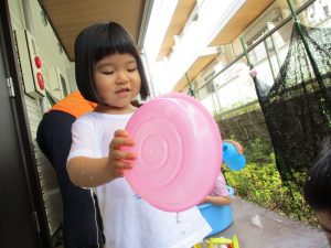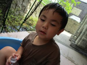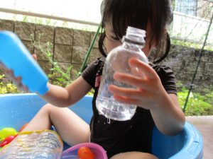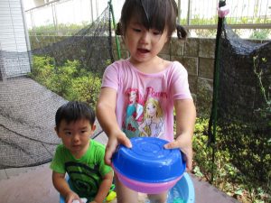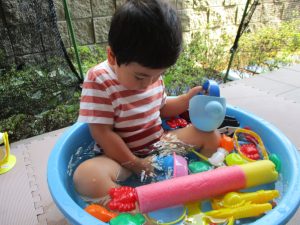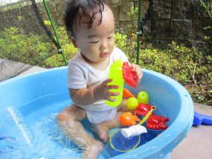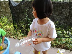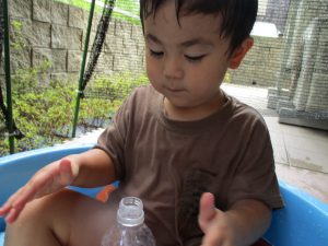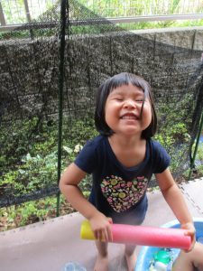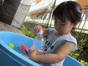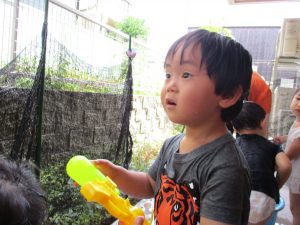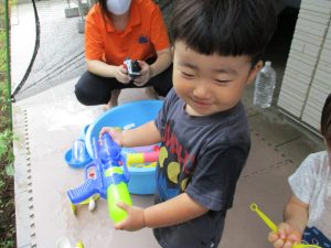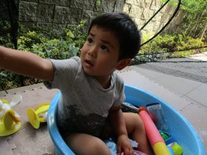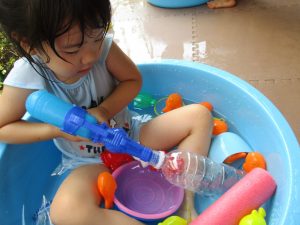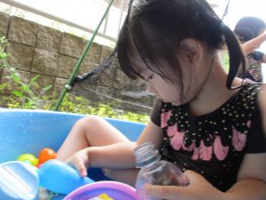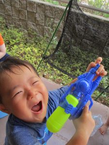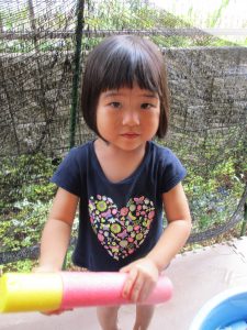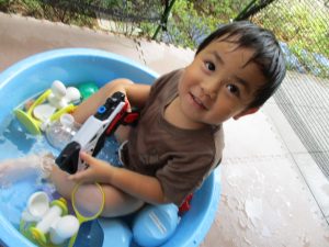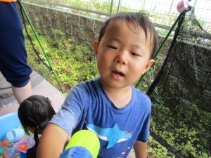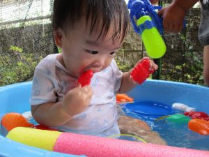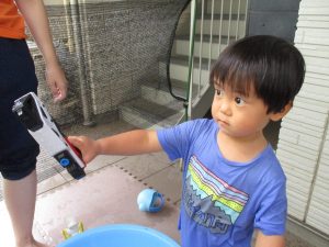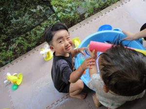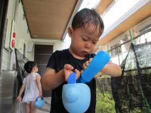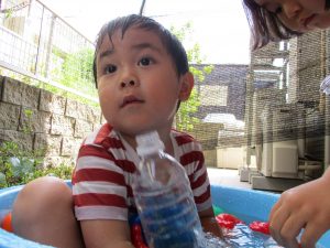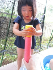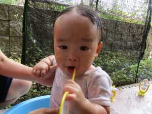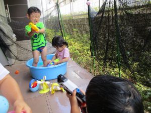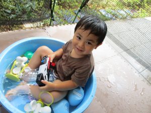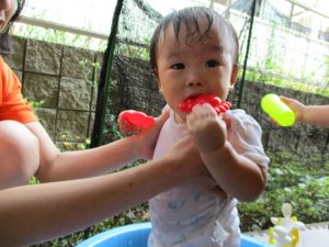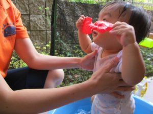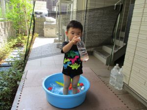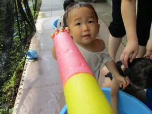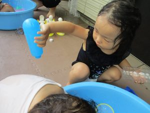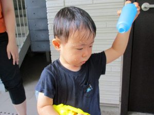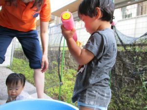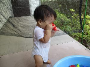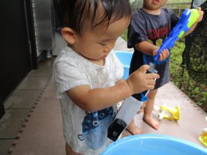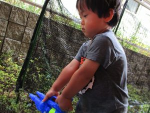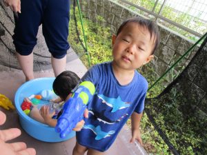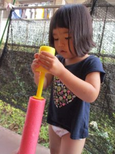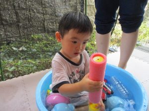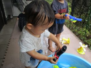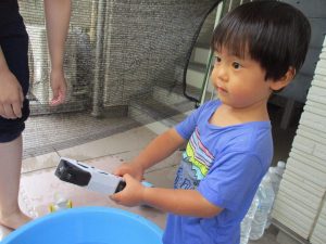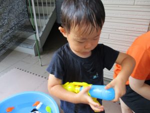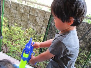 水遊び当初は手こずっていた水鉄砲の使い方もいつの間にかお手の物になり、器用に水を飛ばしております。