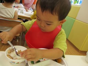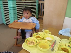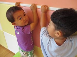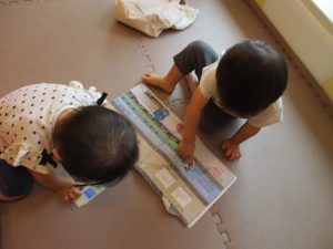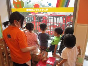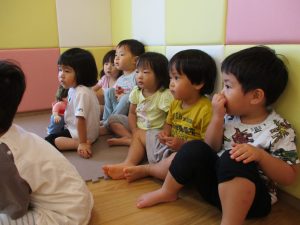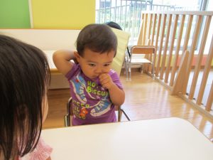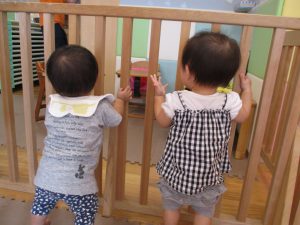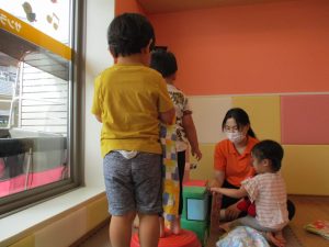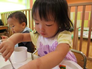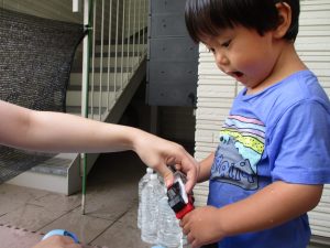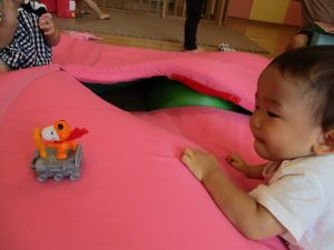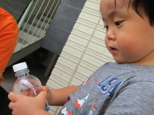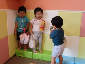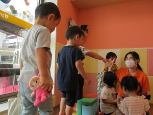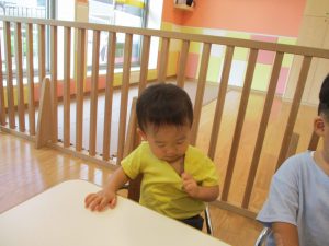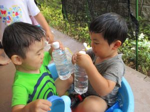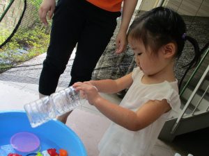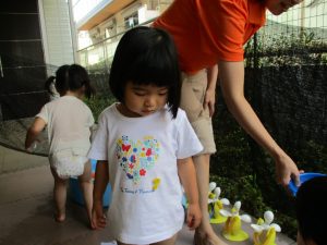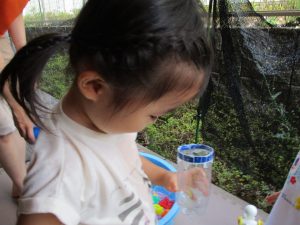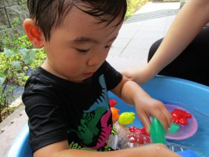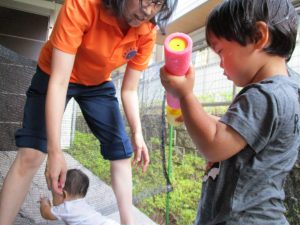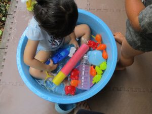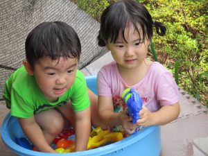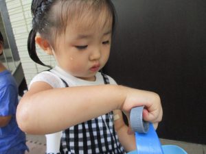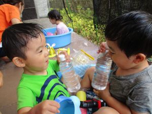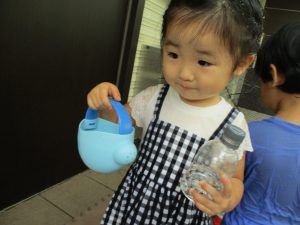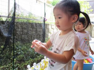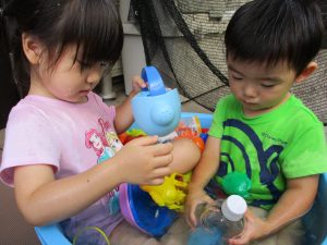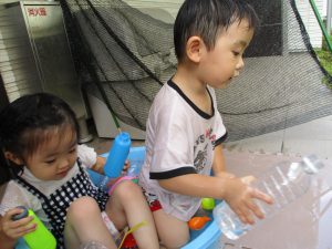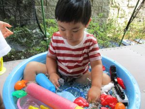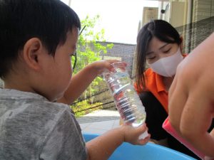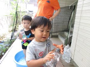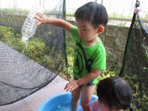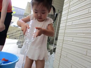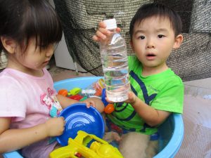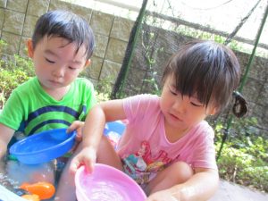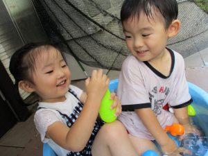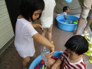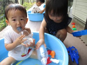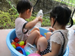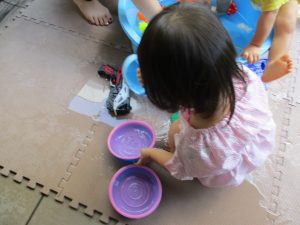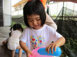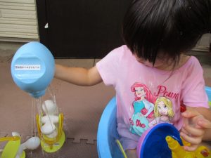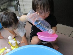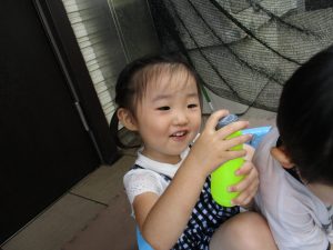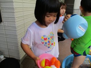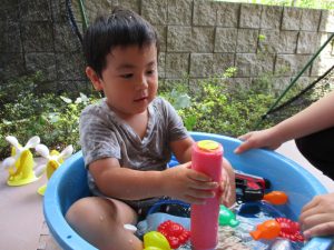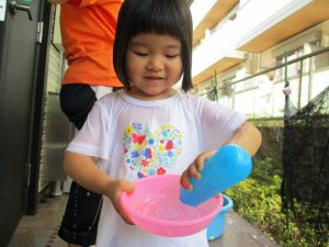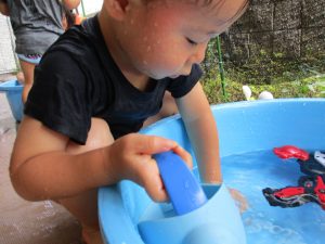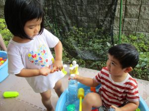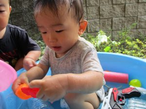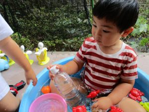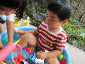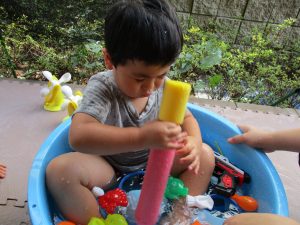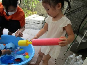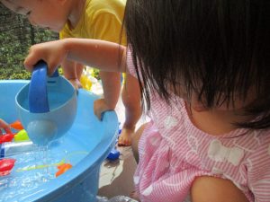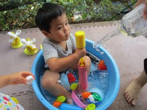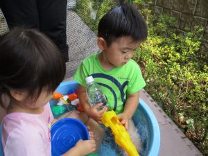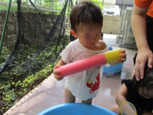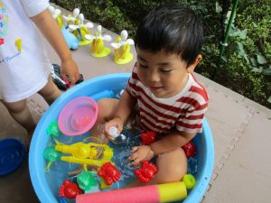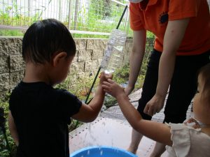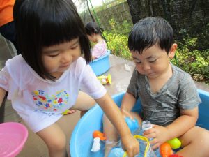 2歳児のお兄さんお姉さんも0歳児や1歳児のお友達に水遊び玩具を「使っていいよ」と優しく貸す姿も多くなり成長を感じます。