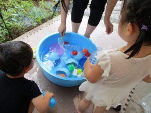 ご家庭でタライを使用する機会はなかなかないと思いますので、お子様達には目新しく映るのかな?