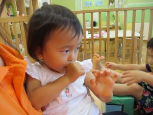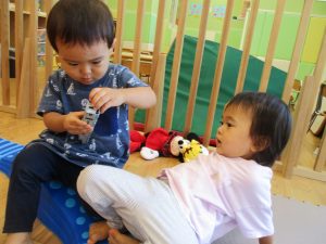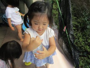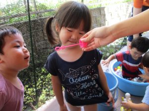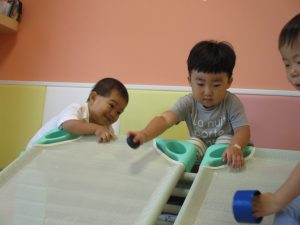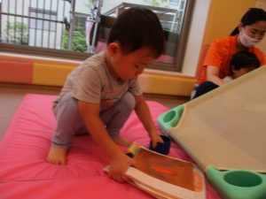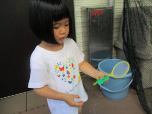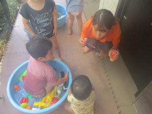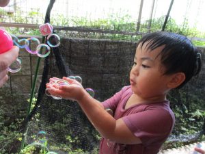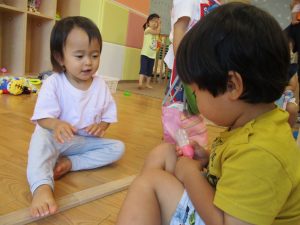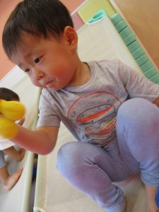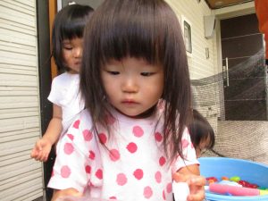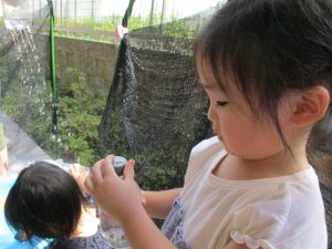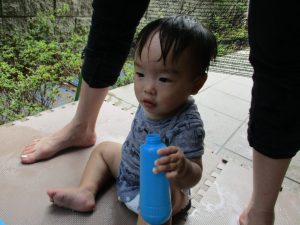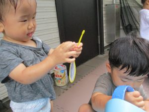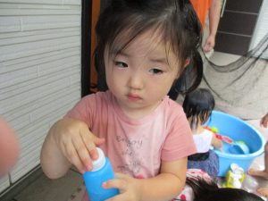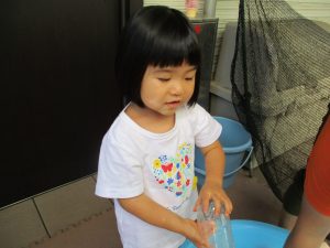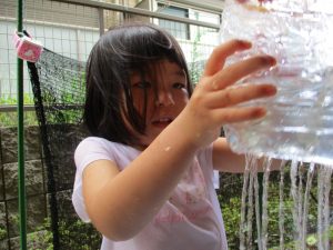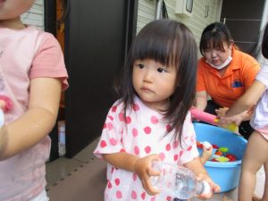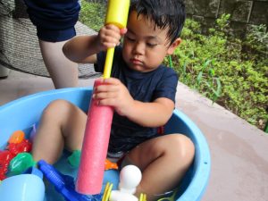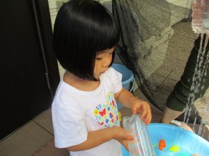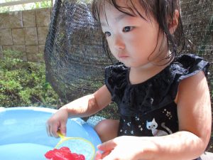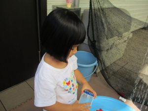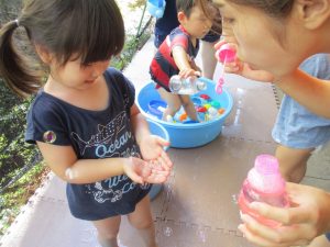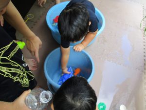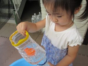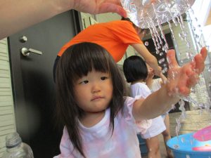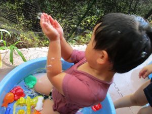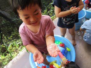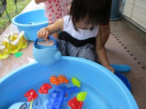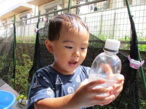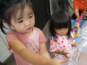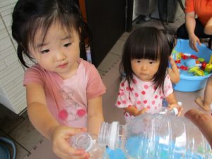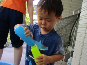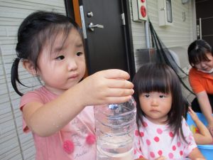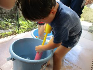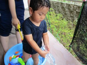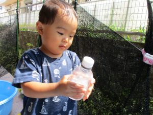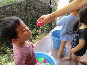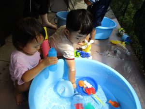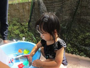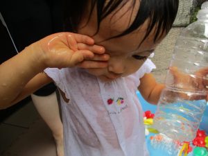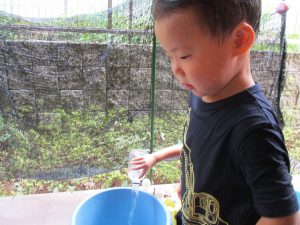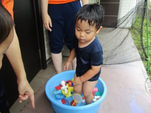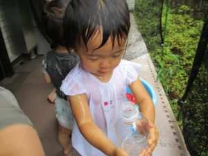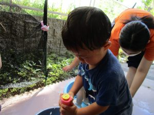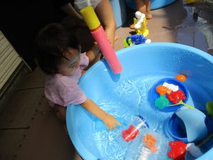 新しいお友達も水に対しての抵抗感もなく水遊び玩具を使用して水の感触を味わっておりました♪