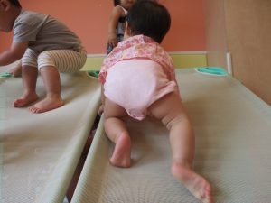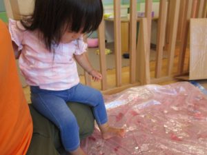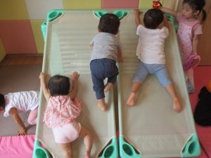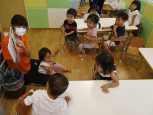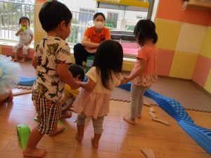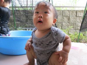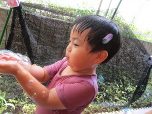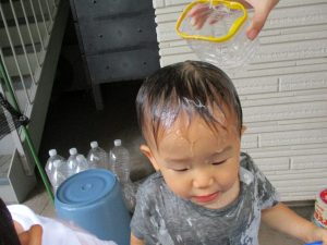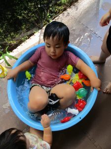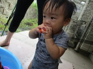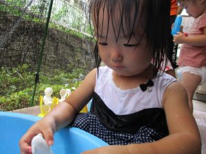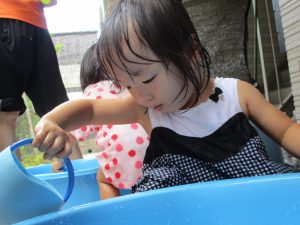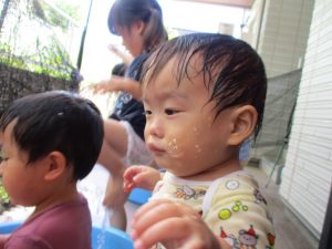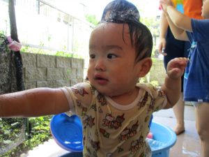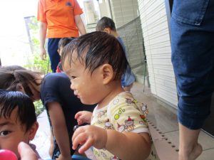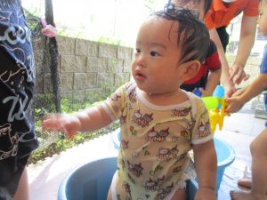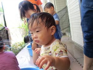 0歳児のお友達もお兄さんお姉さんと一緒に混ざり、水の感触を心行くまで味わっておりました!