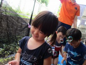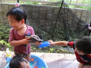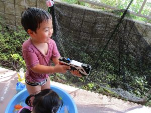 2歳児さんは実習生と水鉄砲を使って互いに水を掛け合う姿もあり、遊び方もとてもお兄さんらしさが溢れておりました♪