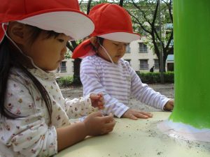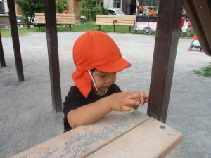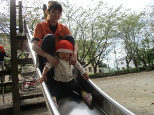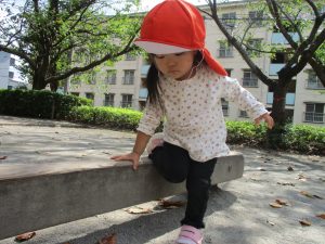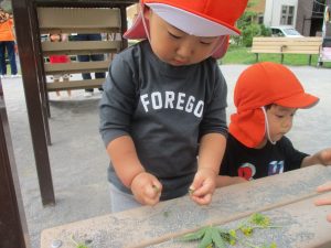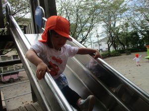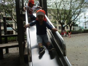 横に長い滑り台で思い切り体を動かして遊んだり、砂場にて木の実を使ったままご遊びを楽しそうに展開しておりました。