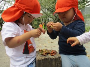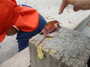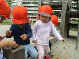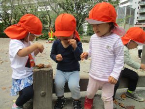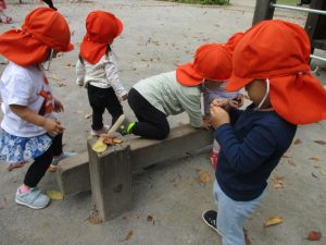 想像以上に枯葉が落ちており、各々が好きな葉を選び固定遊具の端に腰を掛け、葉の見せ合いも楽しんでおりました♪