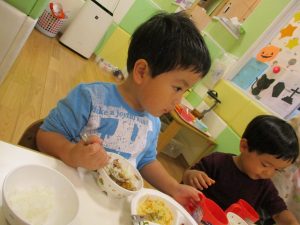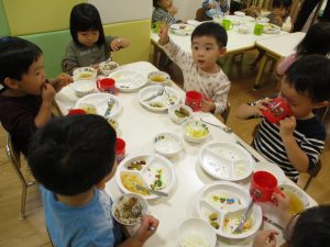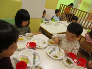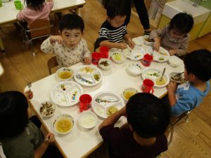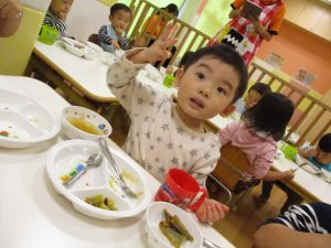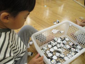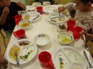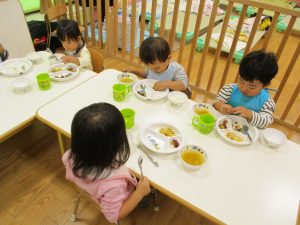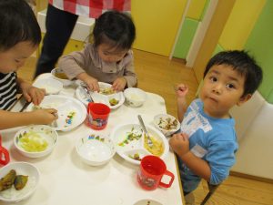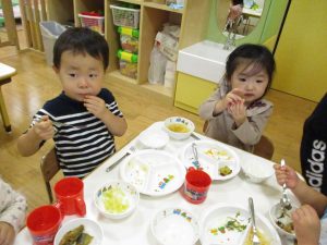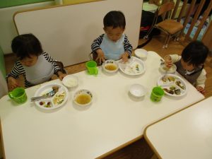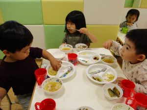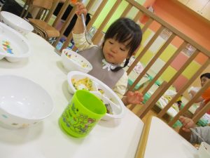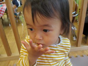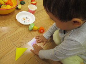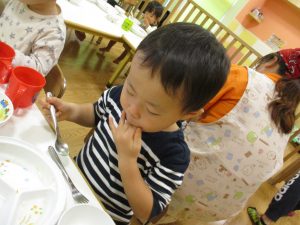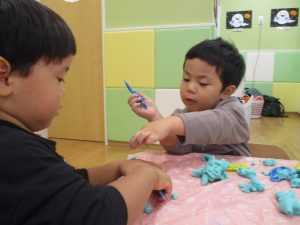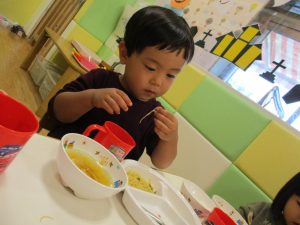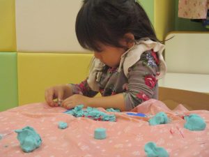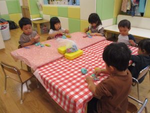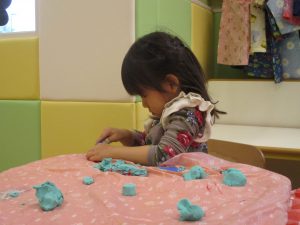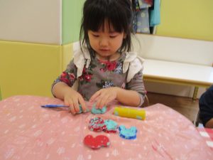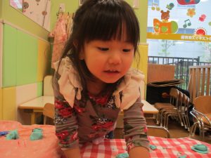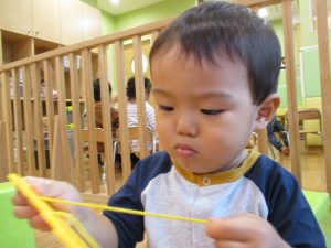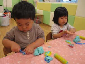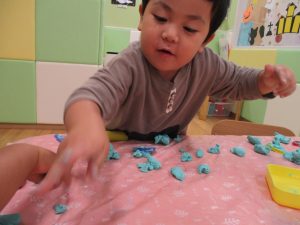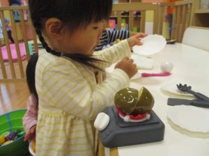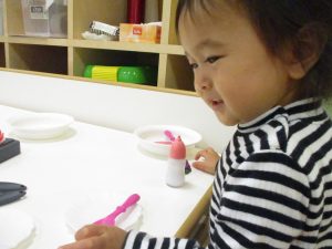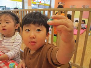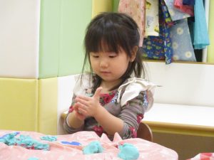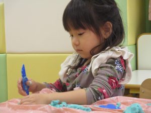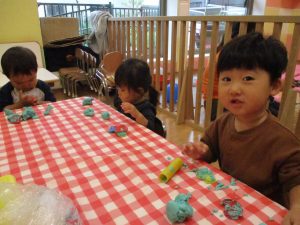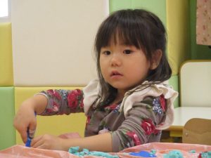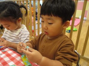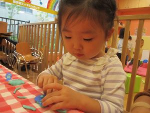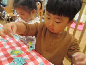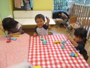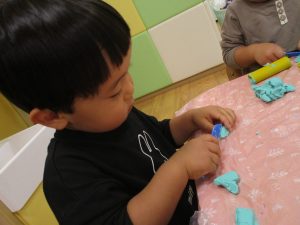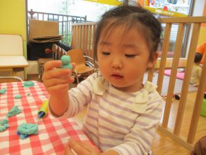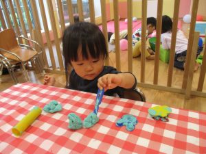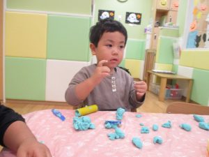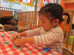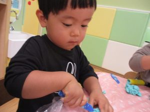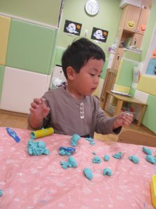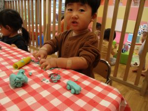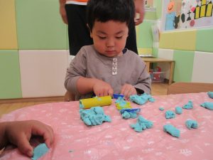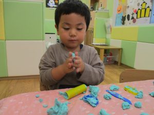 粘土遊びでは箆の使い方がとても上手で「先生見て!」と豪快に粘土を切り分ける2歳児の男の子の豪快さに驚きました♪