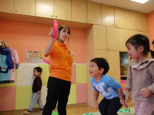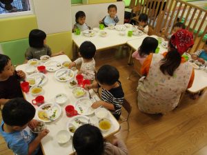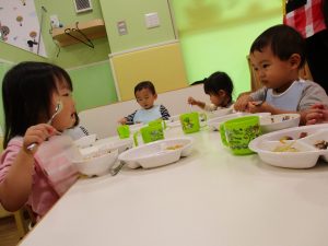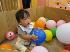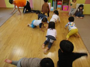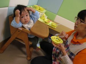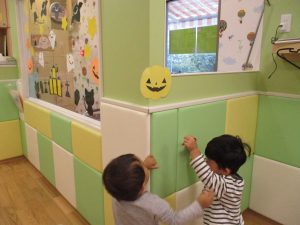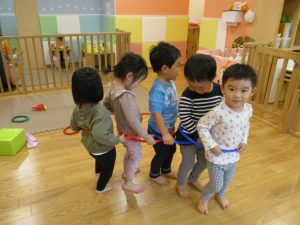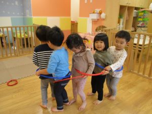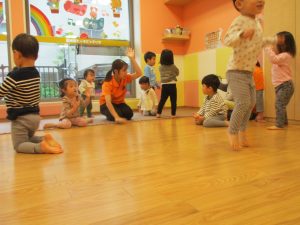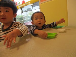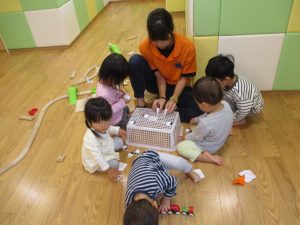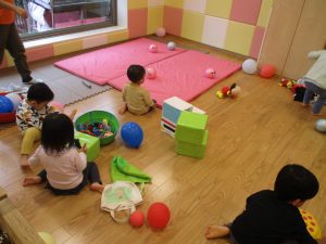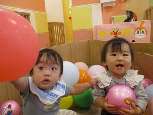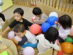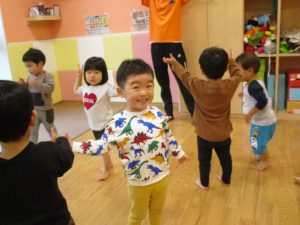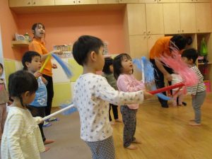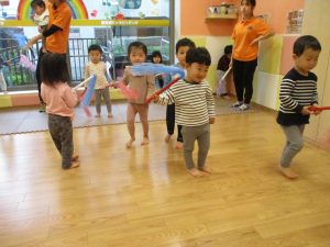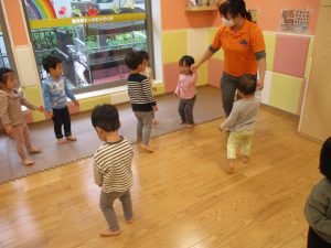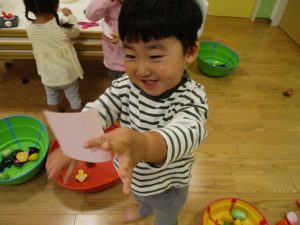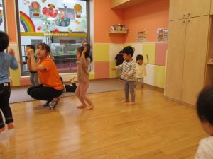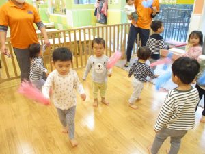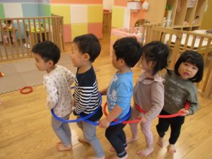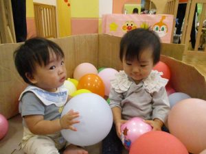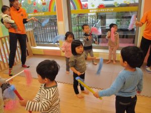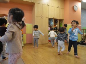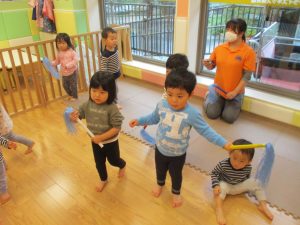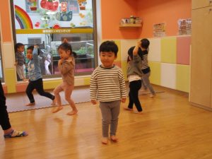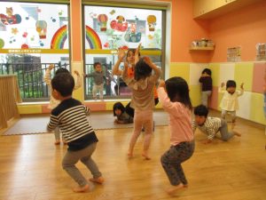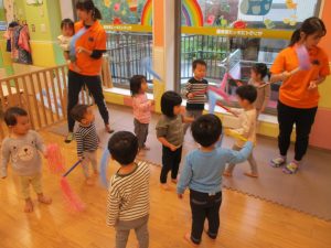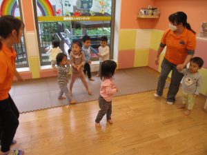 室内でしたが活動を年齢別に分け、2歳児さんは1歳児保育室で、1歳児さんは2歳児保育室でそれぞれ過ごしました♪
