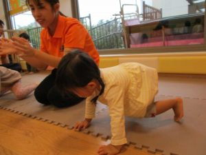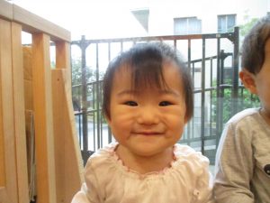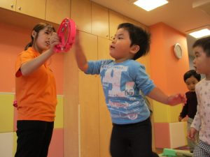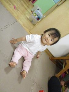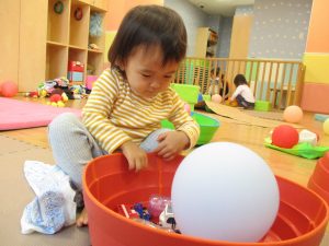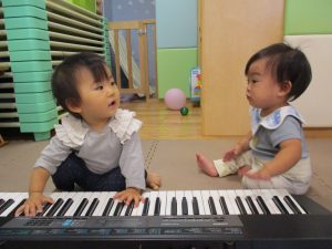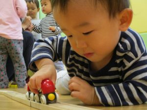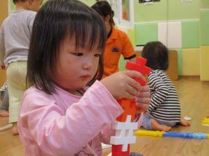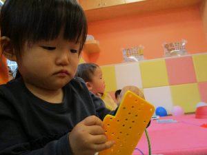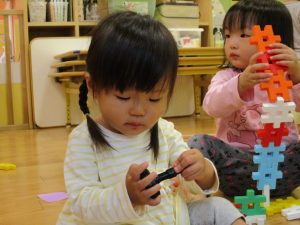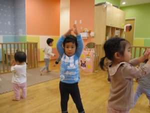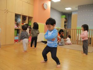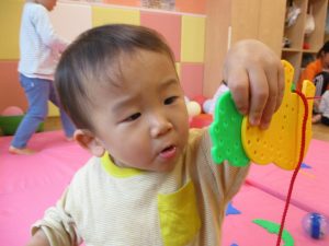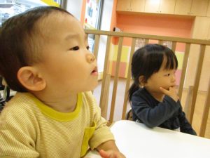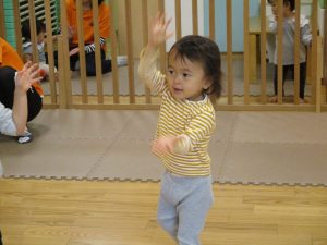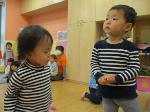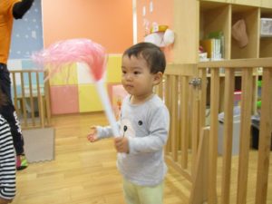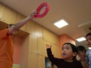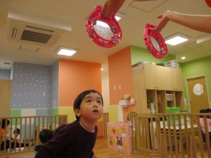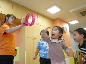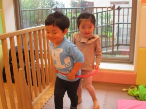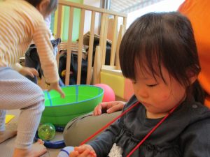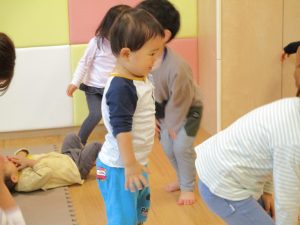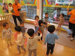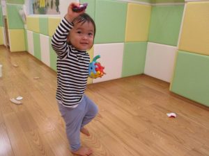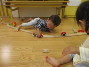 1歳児のお友達もお兄さんお姉さんの遊ぶ姿を見ながら一生懸命真似ようとしており何とも可愛いですね!