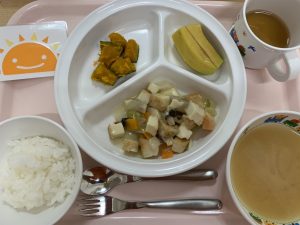 粥 豆腐のあんかけ かぼちゃの甘煮 バナナ