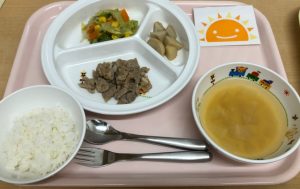 ご飯 味噌汁 豚焼肉 野菜炒め 里芋の煮物