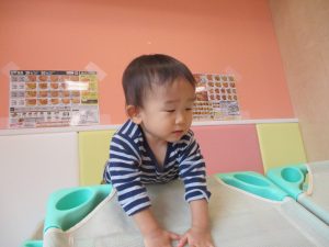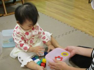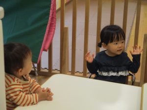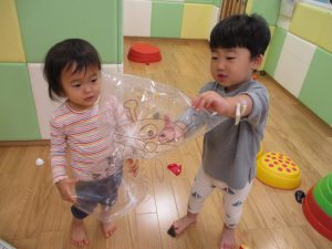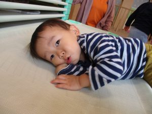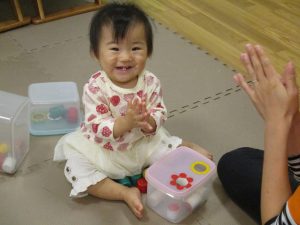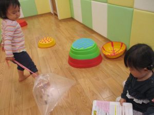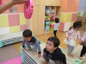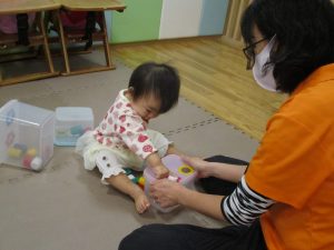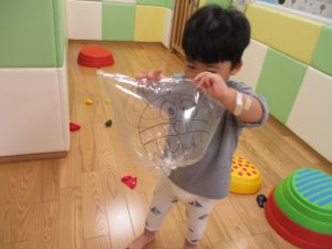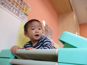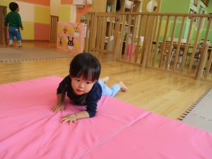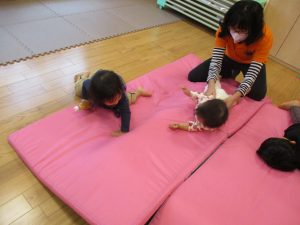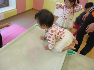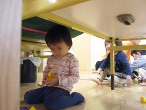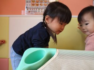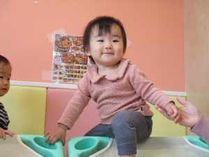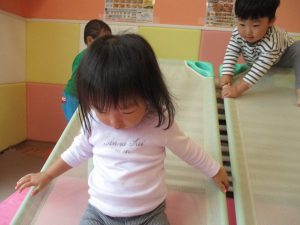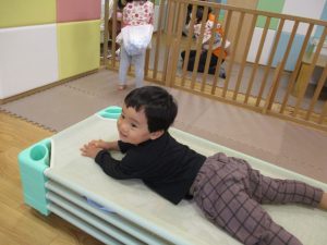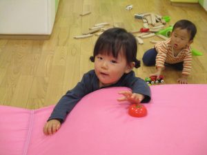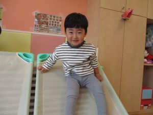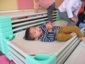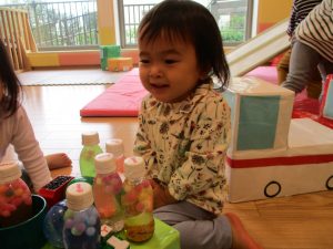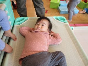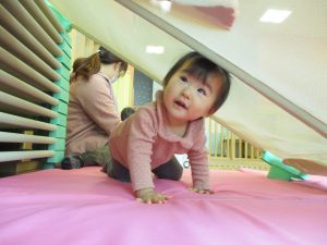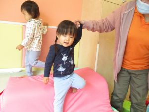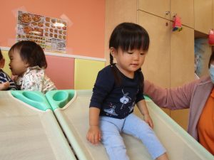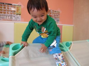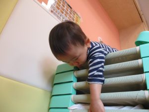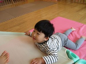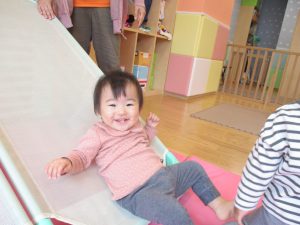コットとマットを組み合わせた変則滑り台で思い切り体を動かしたり、手作り玩具に満足気な表情でした!
