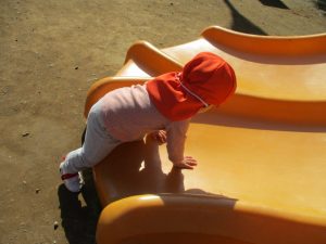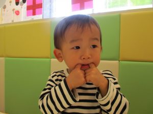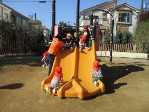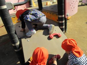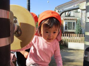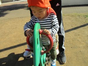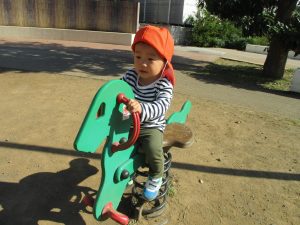 乳児期のお子様に優しい遊具が多数あり、先生達に見守られながらたくさん体を動かして遊びました。