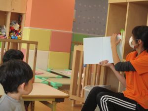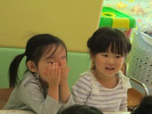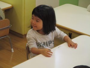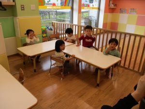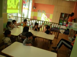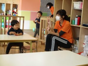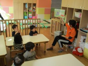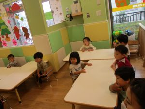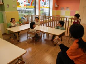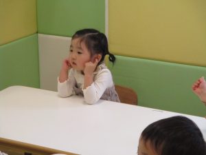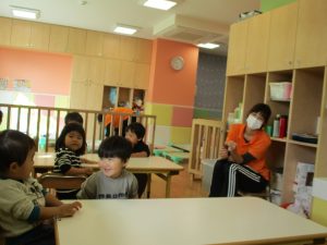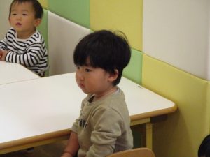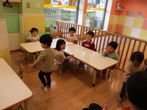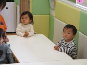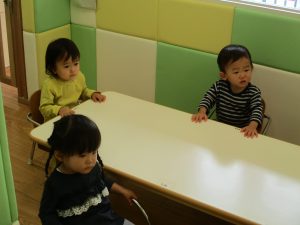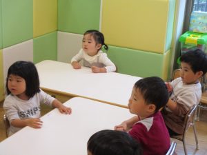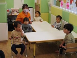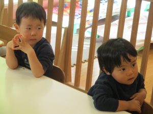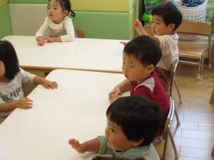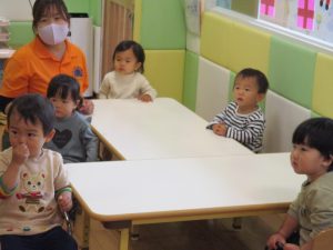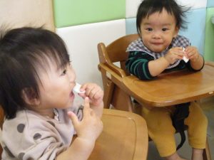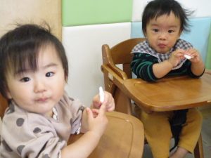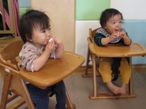 朝の会の隣では0歳児のお友達が朝おやつをモリモリ食べております!