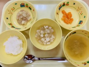 粥 味噌汁 麻婆豆腐風 ツナとじゃが芋煮 にんじんの甘煮