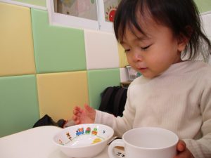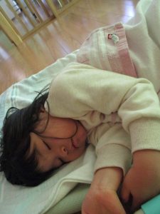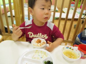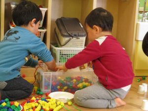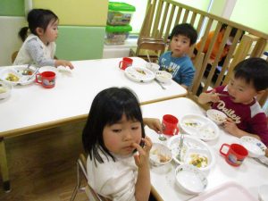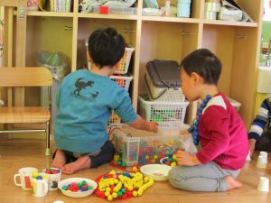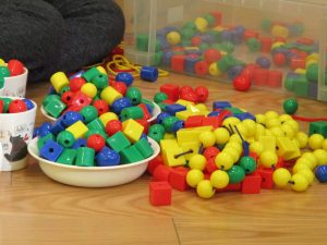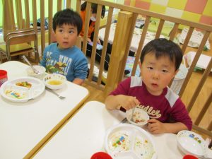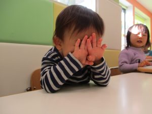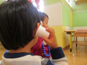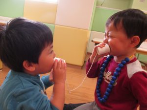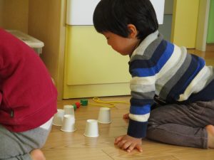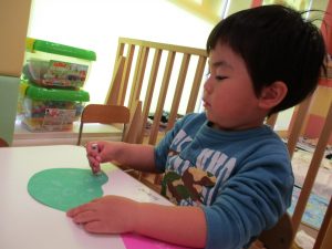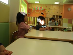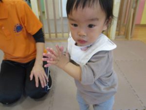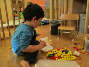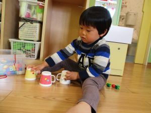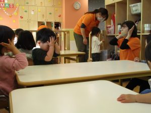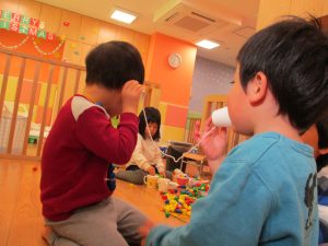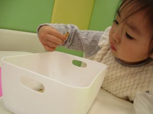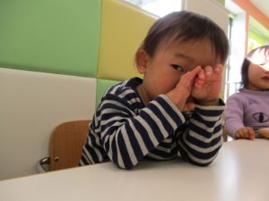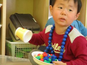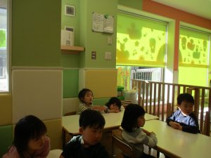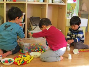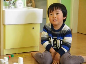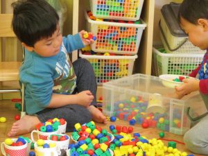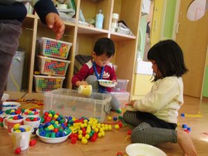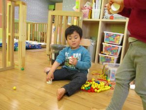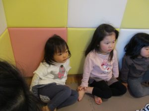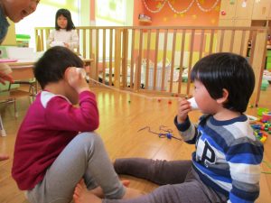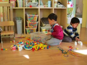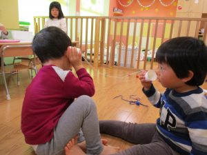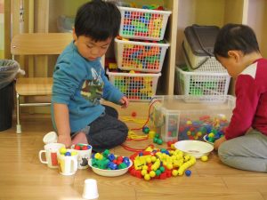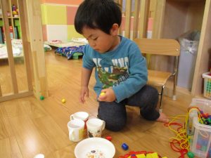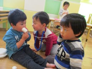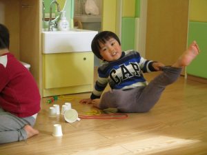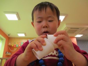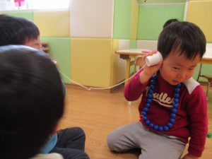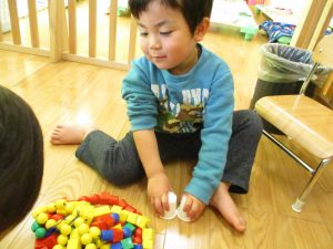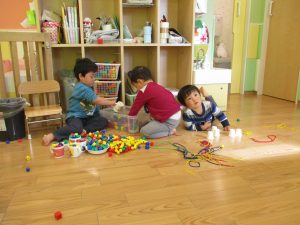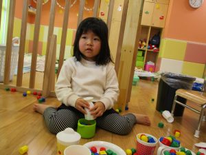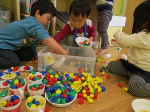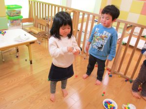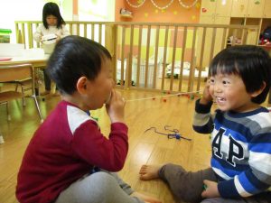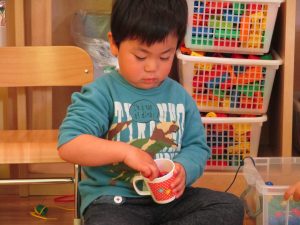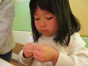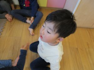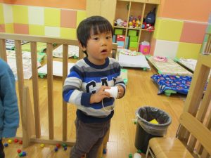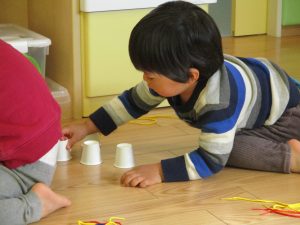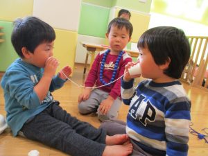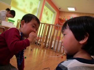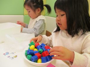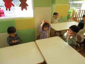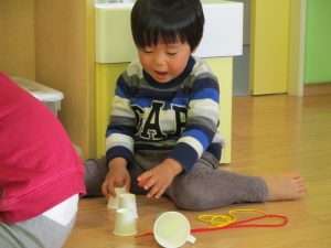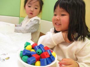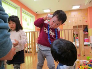 その後は引き続き室内にて紐通しで遊んだり、リズム体操を行い体を動かして楽しい時間を過ごしました。