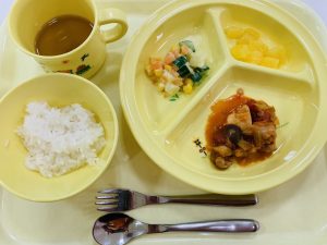 ご飯 鶏肉のトマト煮こみ コロコロサラダ オレンジ