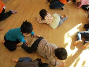 「リトミックやりたい♪」との子ども達の予想外のリクエストが入り初の?アカペラリトミックを戸外で行いました。