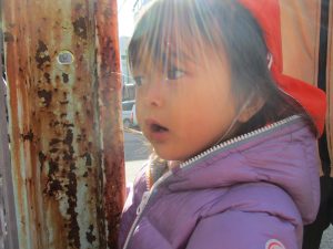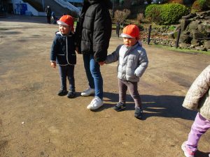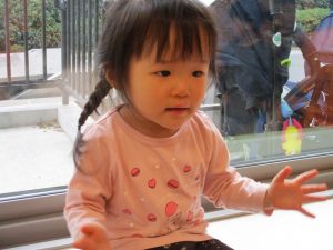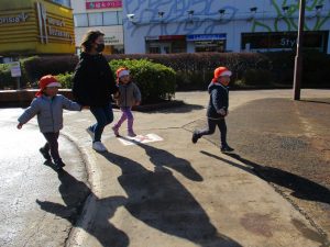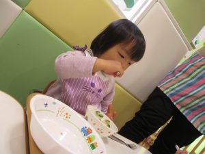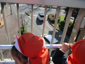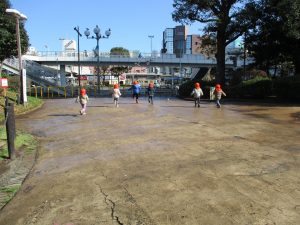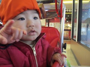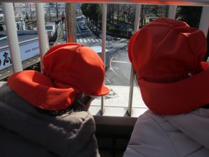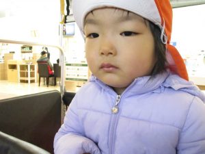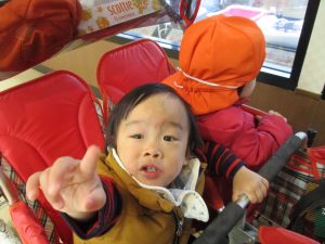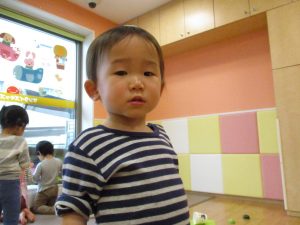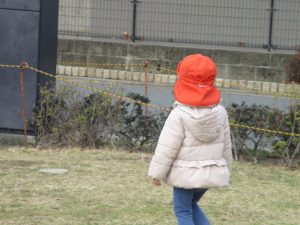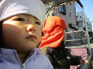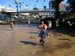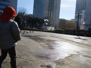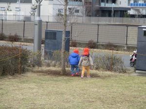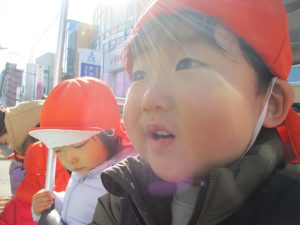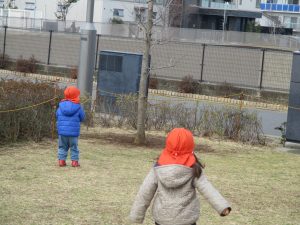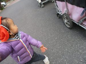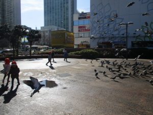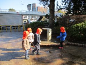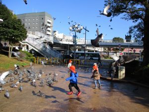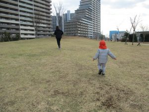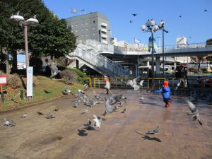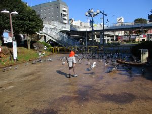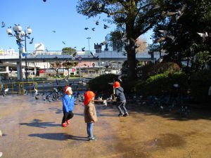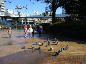 2歳児のお友達は津田沼駅の駅前広場へ遊びに行きました。