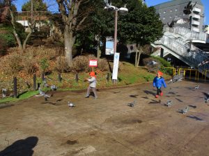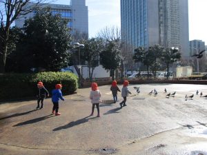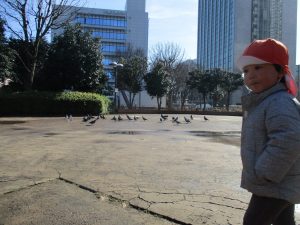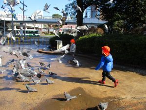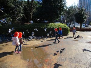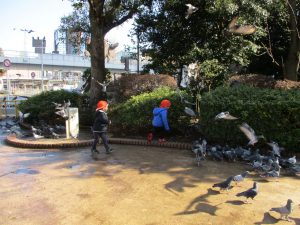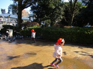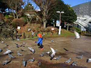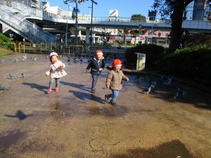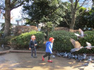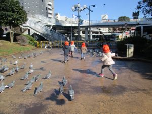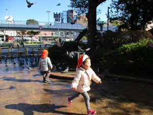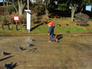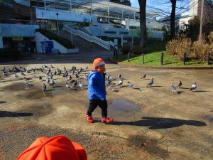 広場ではの鳩さんと一緒に追いかけっこを楽しみました!