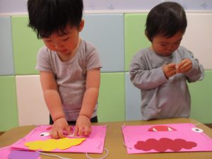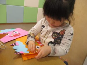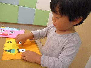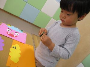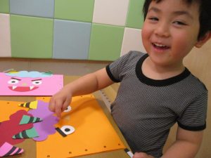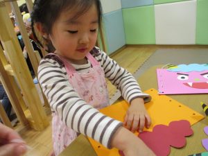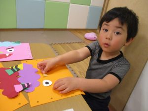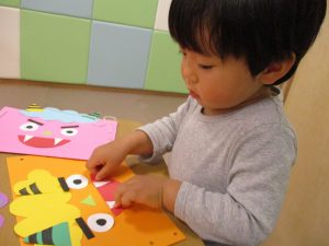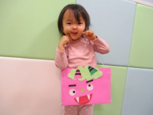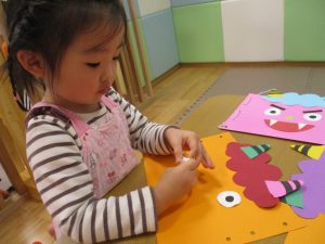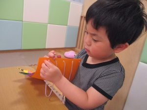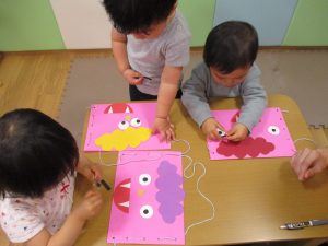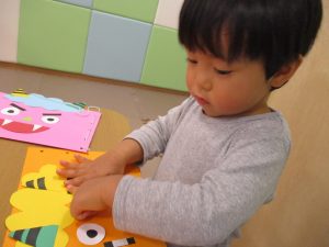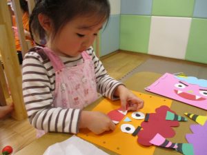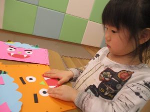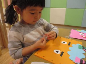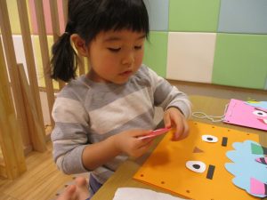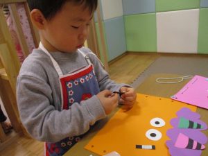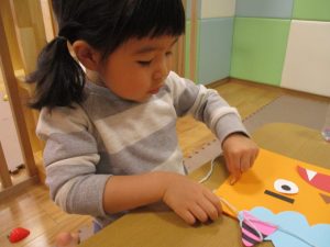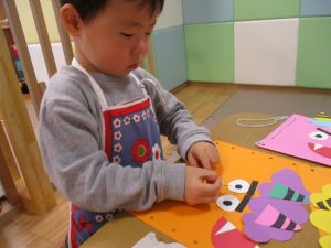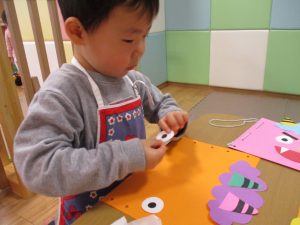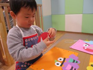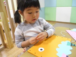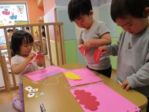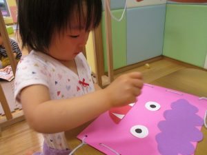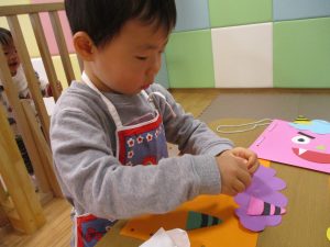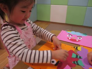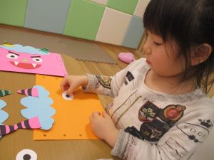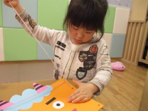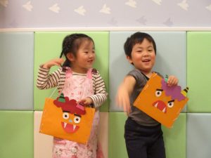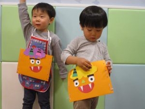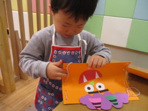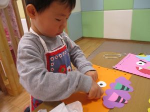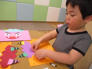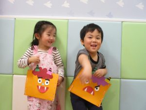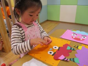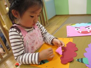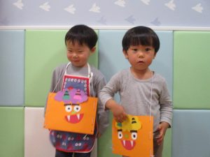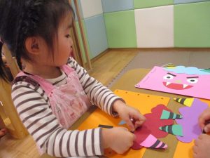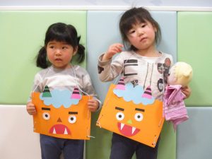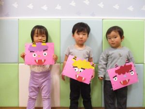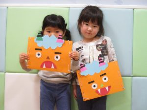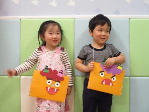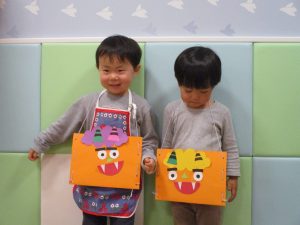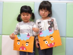 節分製作(鬼のカバン)を行いましたが、鬼の顔のパーツを個性豊かに貼ったり紐通しでカバンの両サイドを閉じたり等、盛りだくさんの内容となりとても可愛いカバンが完成致しました。