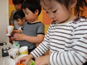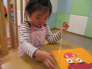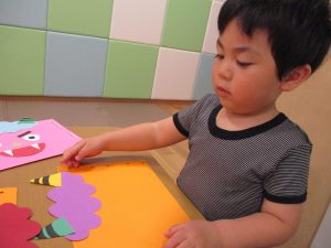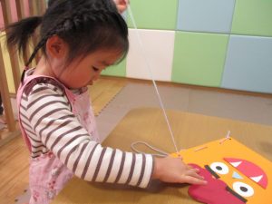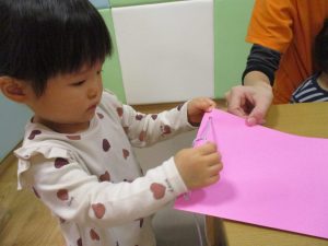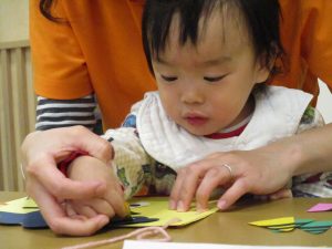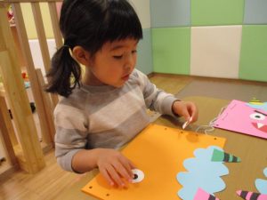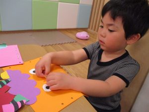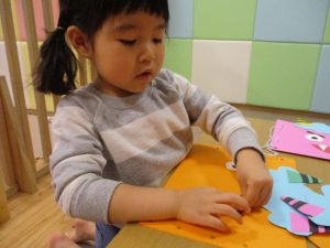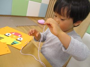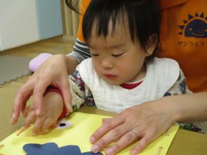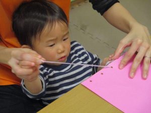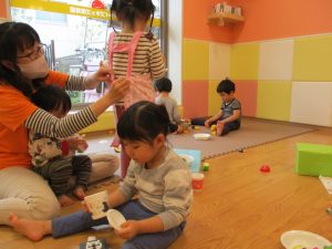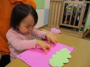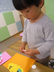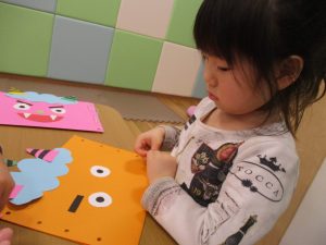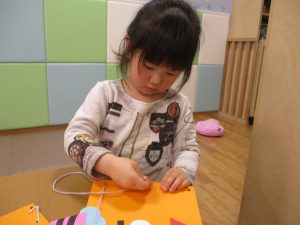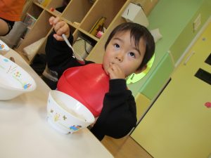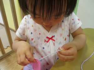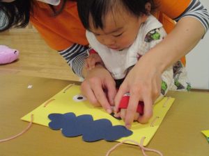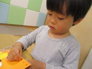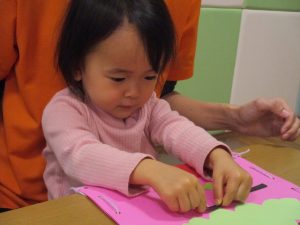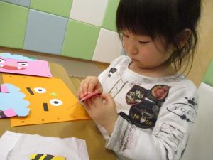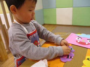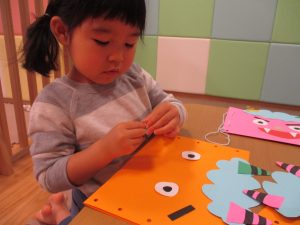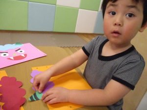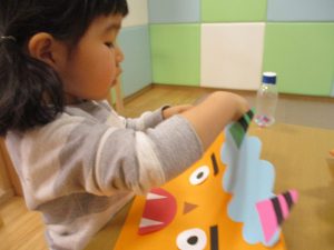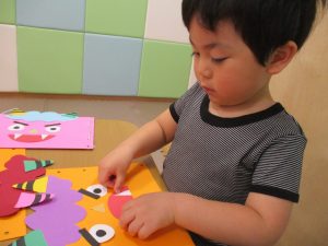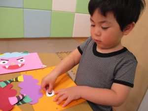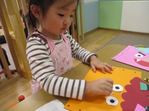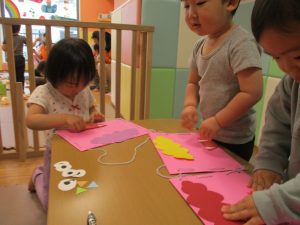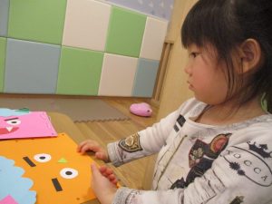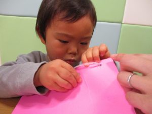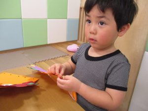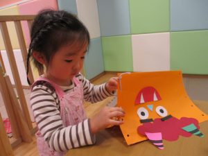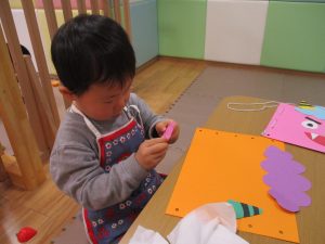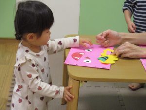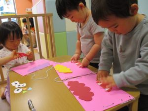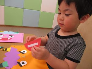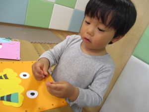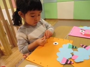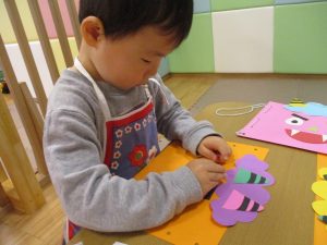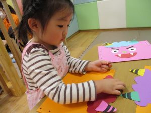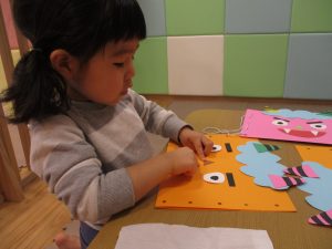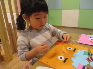 節分製作(鬼のカバン)を行いましたが、鬼の顔のパーツを個性豊かに貼ったり紐通しでカバンの両サイドを閉じたり等、盛りだくさんの内容となりとても可愛いカバンが完成致しました。