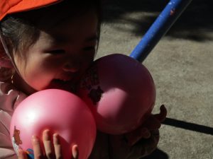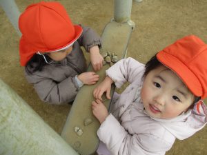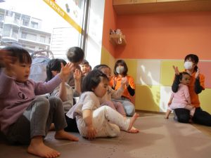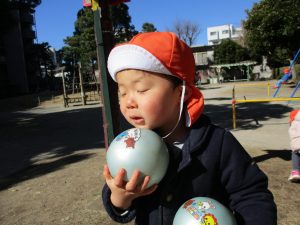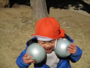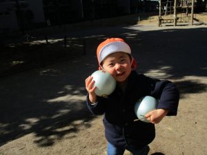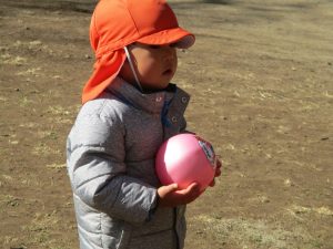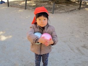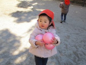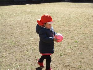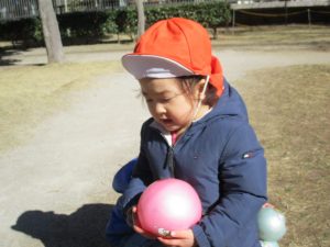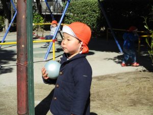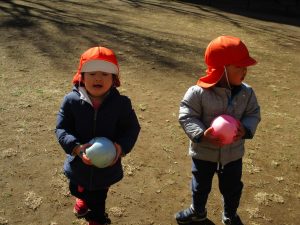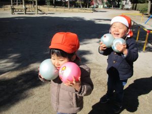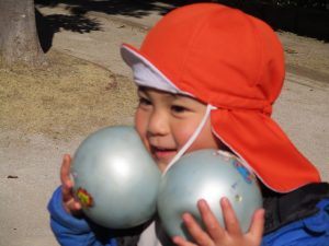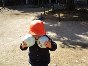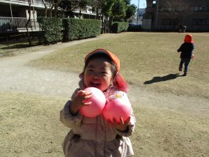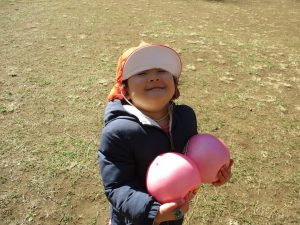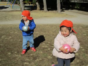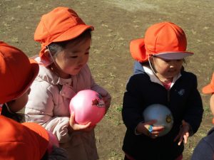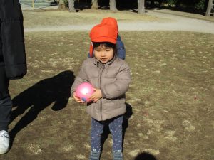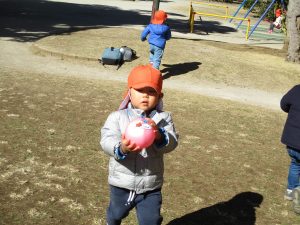 固定遊具で楽しく遊んだり、持参したボールを投げたり追いかけたりたくさん拾い集めたり等、思い切り体を動かして遊びました。