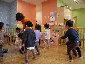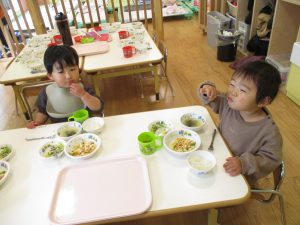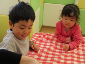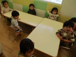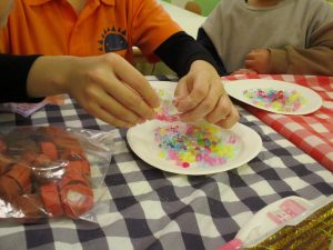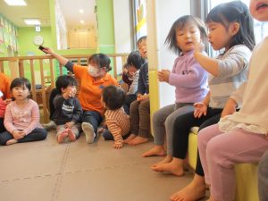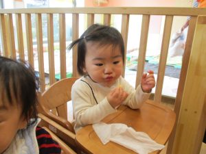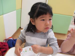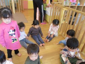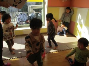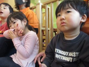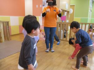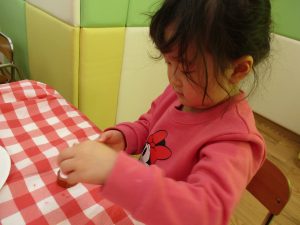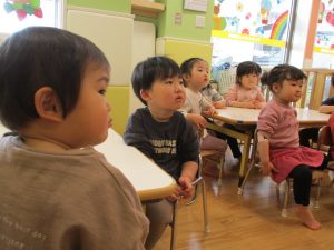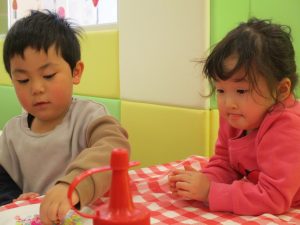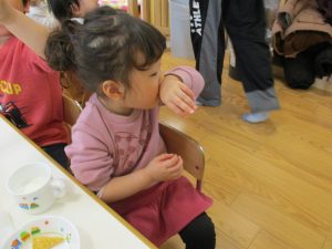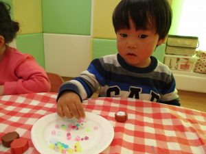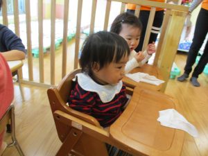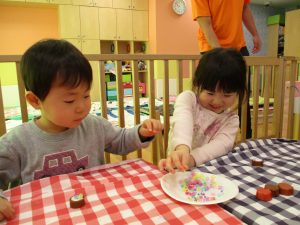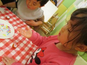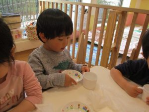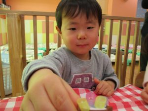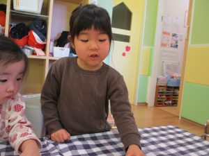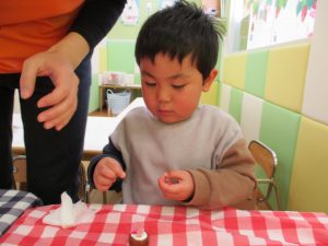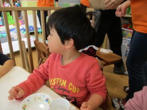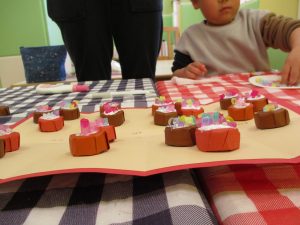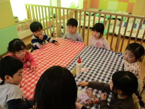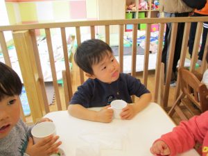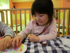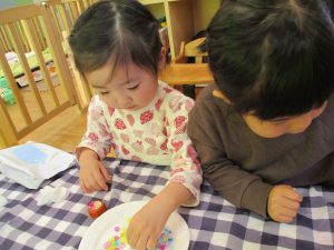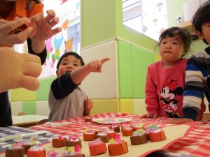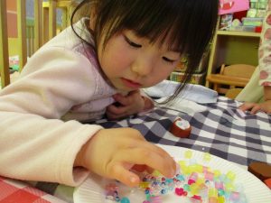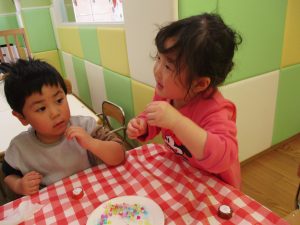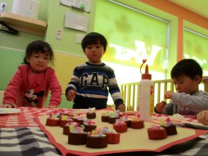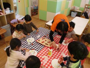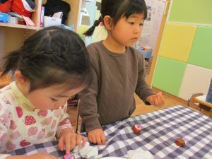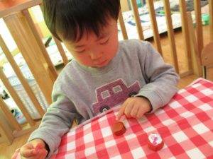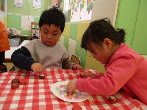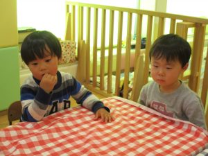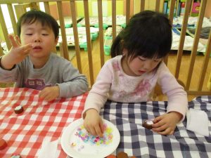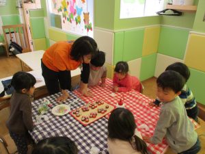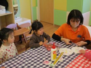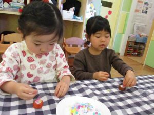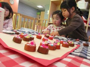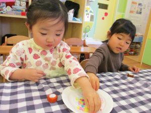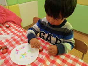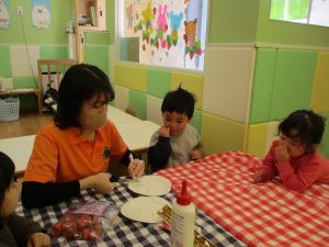 2歳児さんはなにやらこの時期らしさ満載の製作を楽しんでおります!