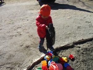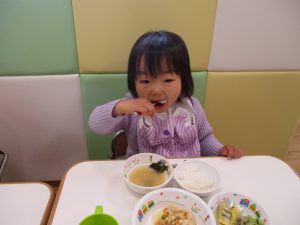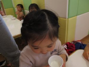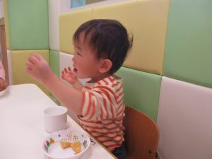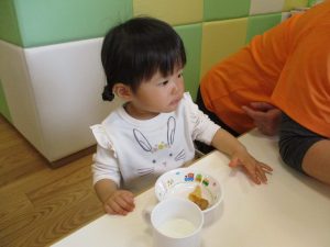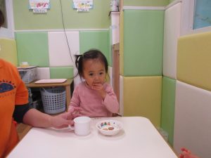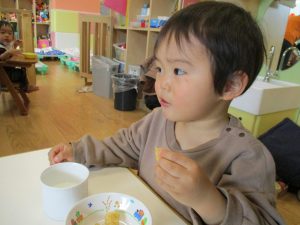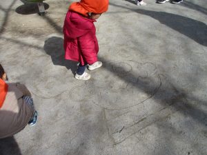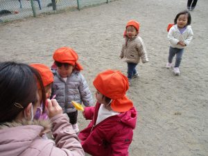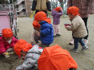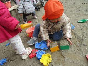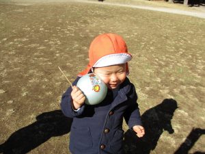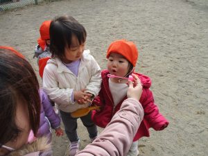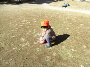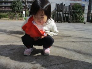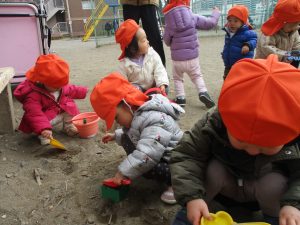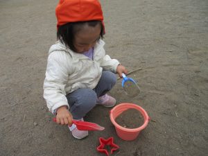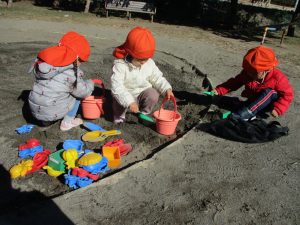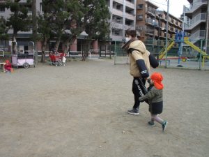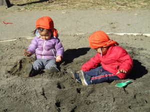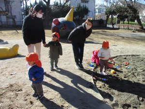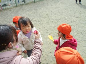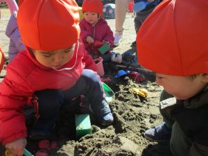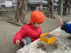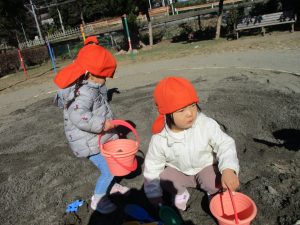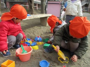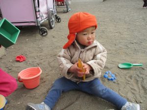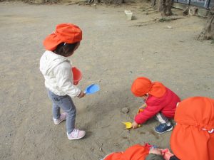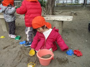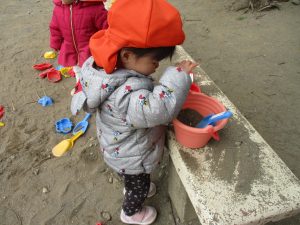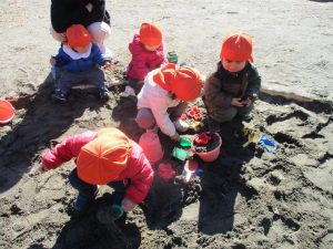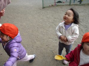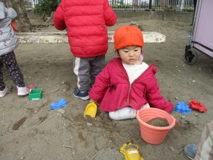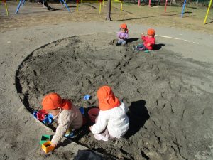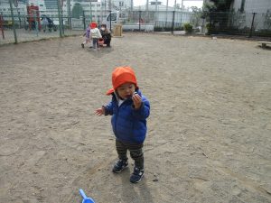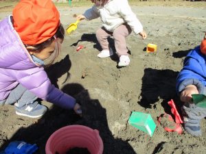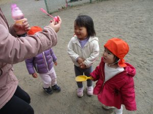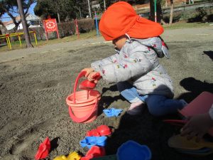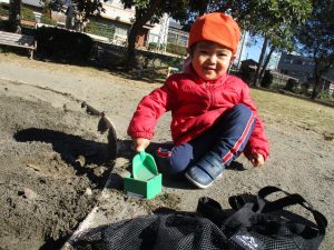 広場でシャボン玉を追いかけたり先生や友達と一緒に追いかけっこをを楽しんだり、砂場セットをたくさん使ってままごと遊びも豪快に展開しておりました。