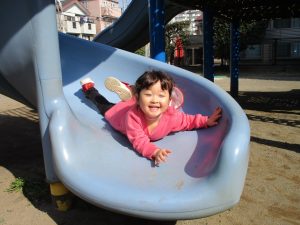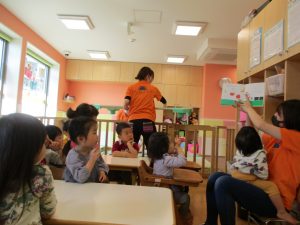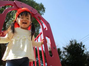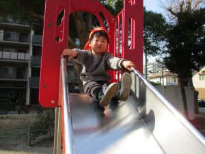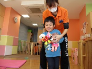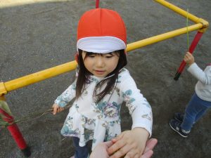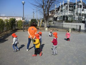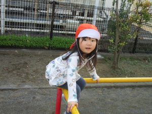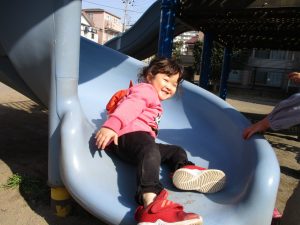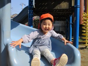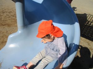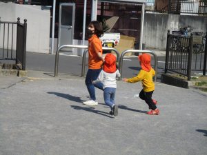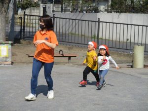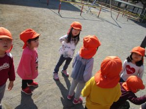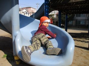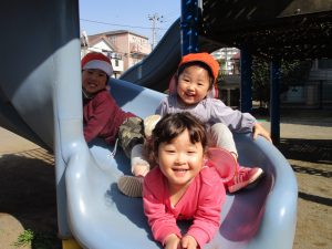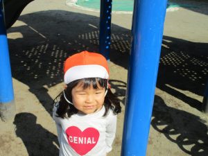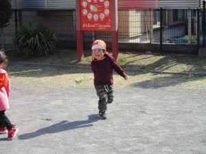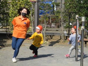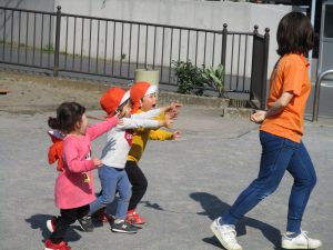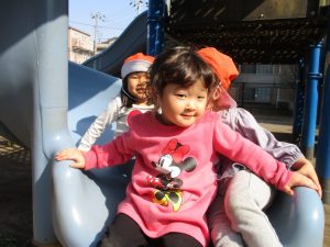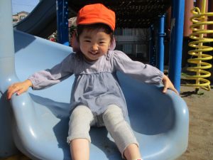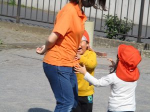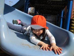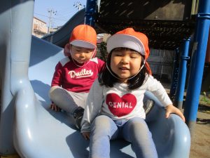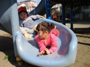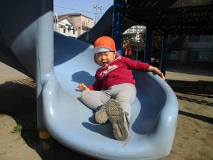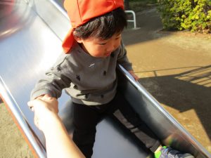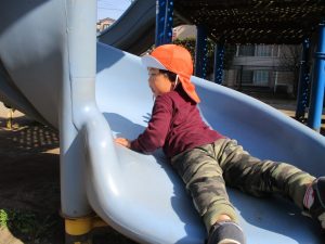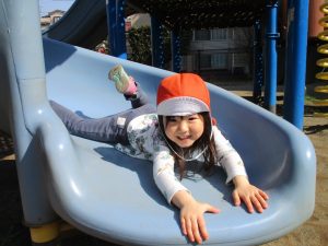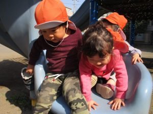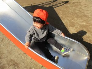 クルクルすべり台で繰り返し遊んだり、先生と一緒に簡単なゲーム遊びを行い思い切り体を動かして遊びました。