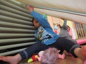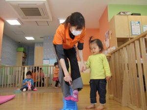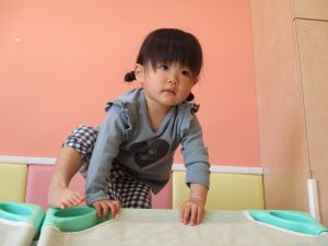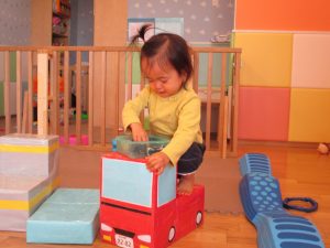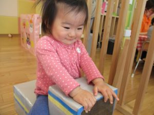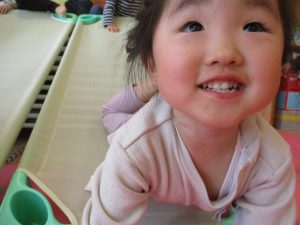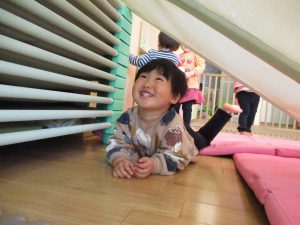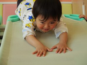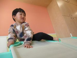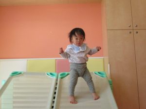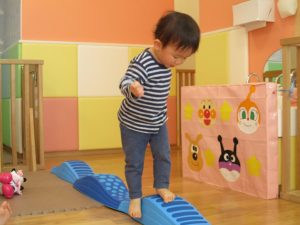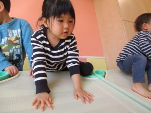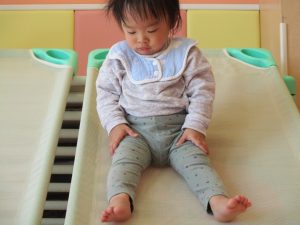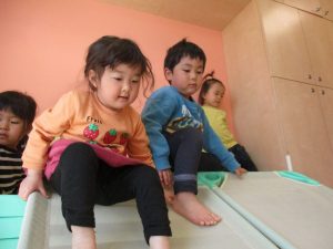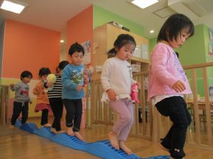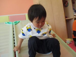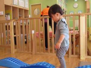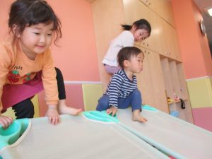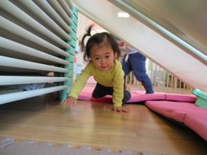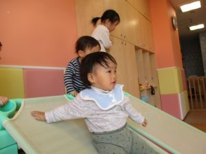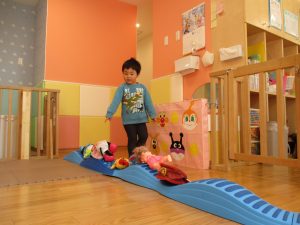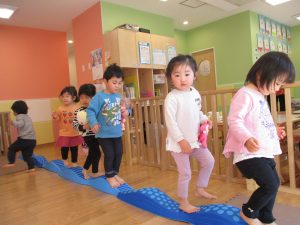 1歳児保育室では平均台を組み合わせたサーキットや、コットを組み合わせた滑り台でたくさん体を動かして遊びました。