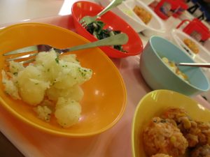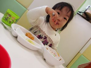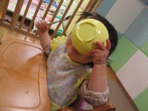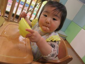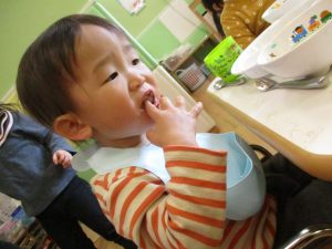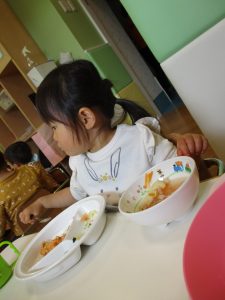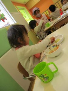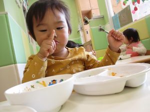 「今日のご飯は名前何?」と2歳児さんもよく聞いてくれるので、給食の時間に献立を読み上げる時間も少しずつ作り食育の一環と捉えております。