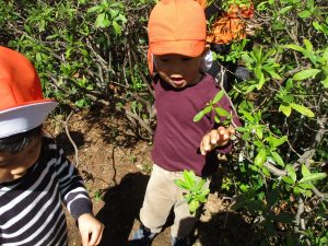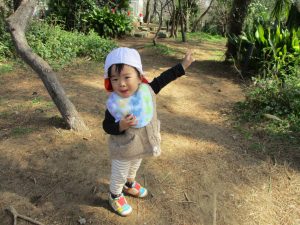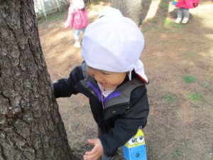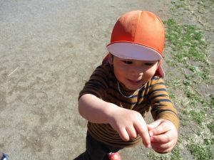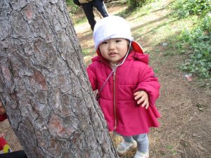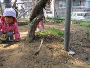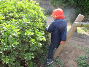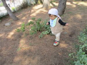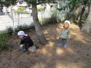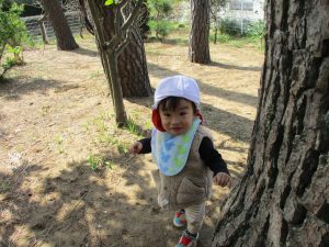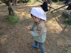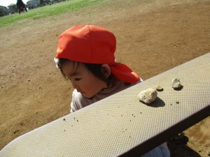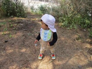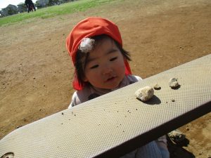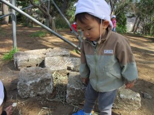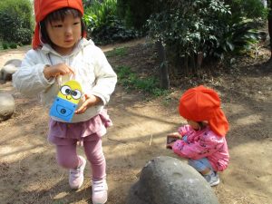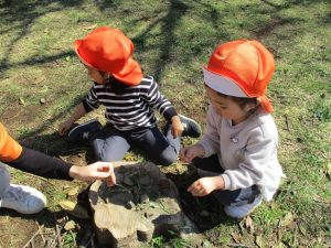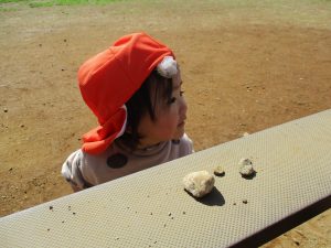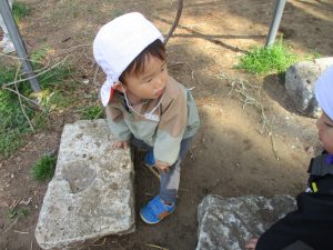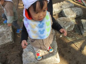 切り株の上に小石や玉ねぎ型の木の実?のような物もあり、不思議そうな表情を見せながらもそれらを使って、楽しそうにままごと遊びを展開しておりました♪