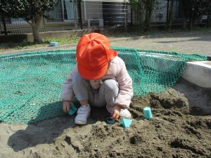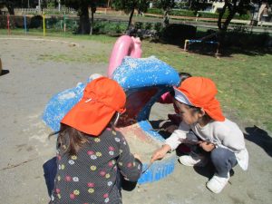 砂場に夢中で近隣に住む親子連れの方とも一緒に遊ばせて頂きましたが、皆で仲良く山や道を作ったりして楽しく過ごせました♪