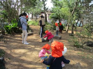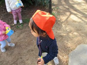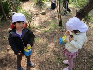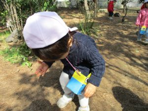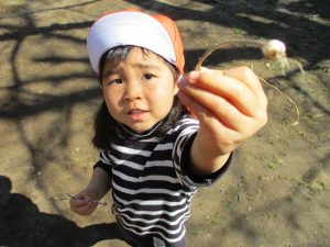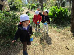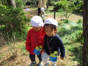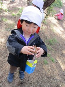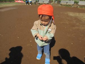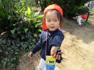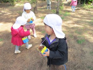 お散歩バックの中に松ぼっくりを始め、様々な木の実や石を思い思いに詰め込みました♪