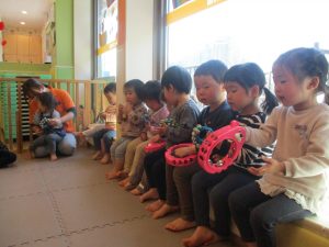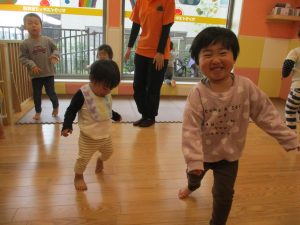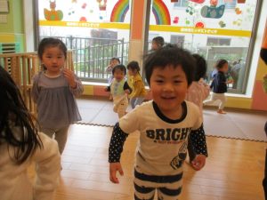 2歳児さんは英単語の意味が良く理解できている様で「レッド!」と先生が言うと赤色のカードの所まで楽しそうに走っていきます!