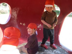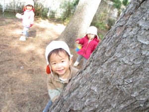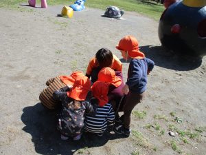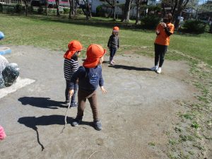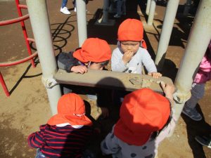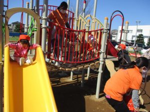 かくれんぼやグーパージャンプ等、簡単なルールのある遊びを皆で楽しんだり、固定遊具で思い切り体を動かしました!