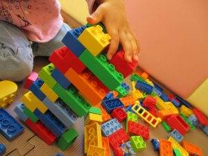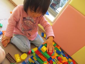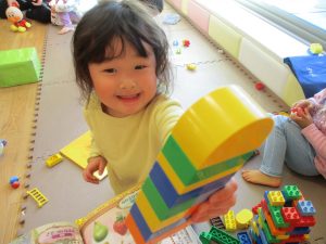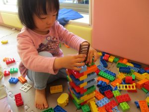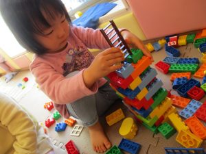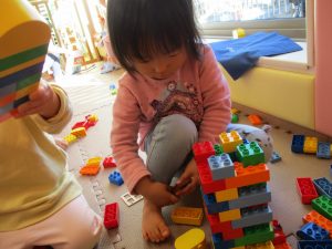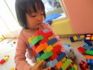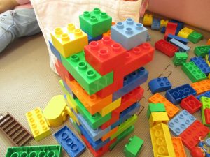 1歳児クラスのお友達が見事なまでのレゴブロックタワーを作り上げました!